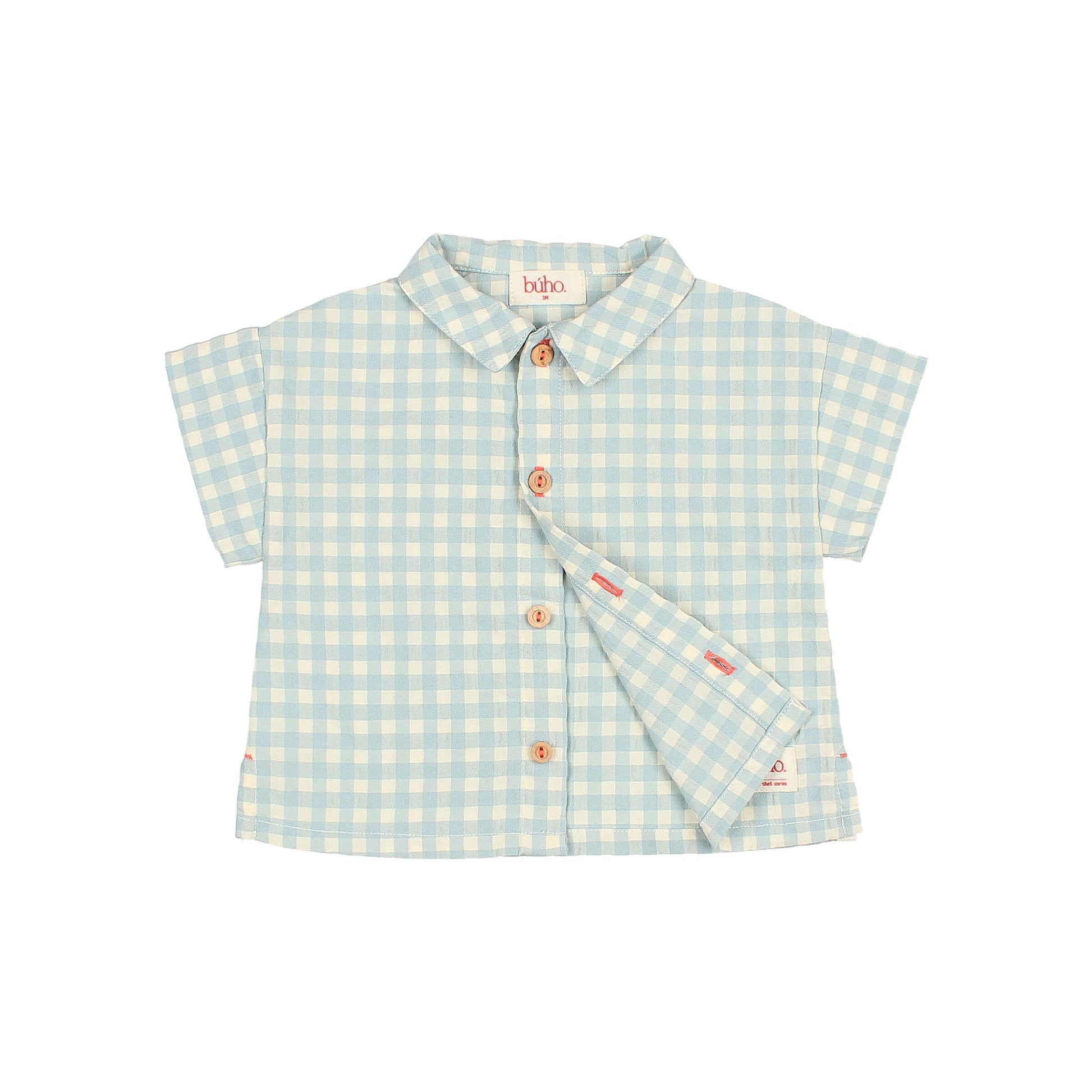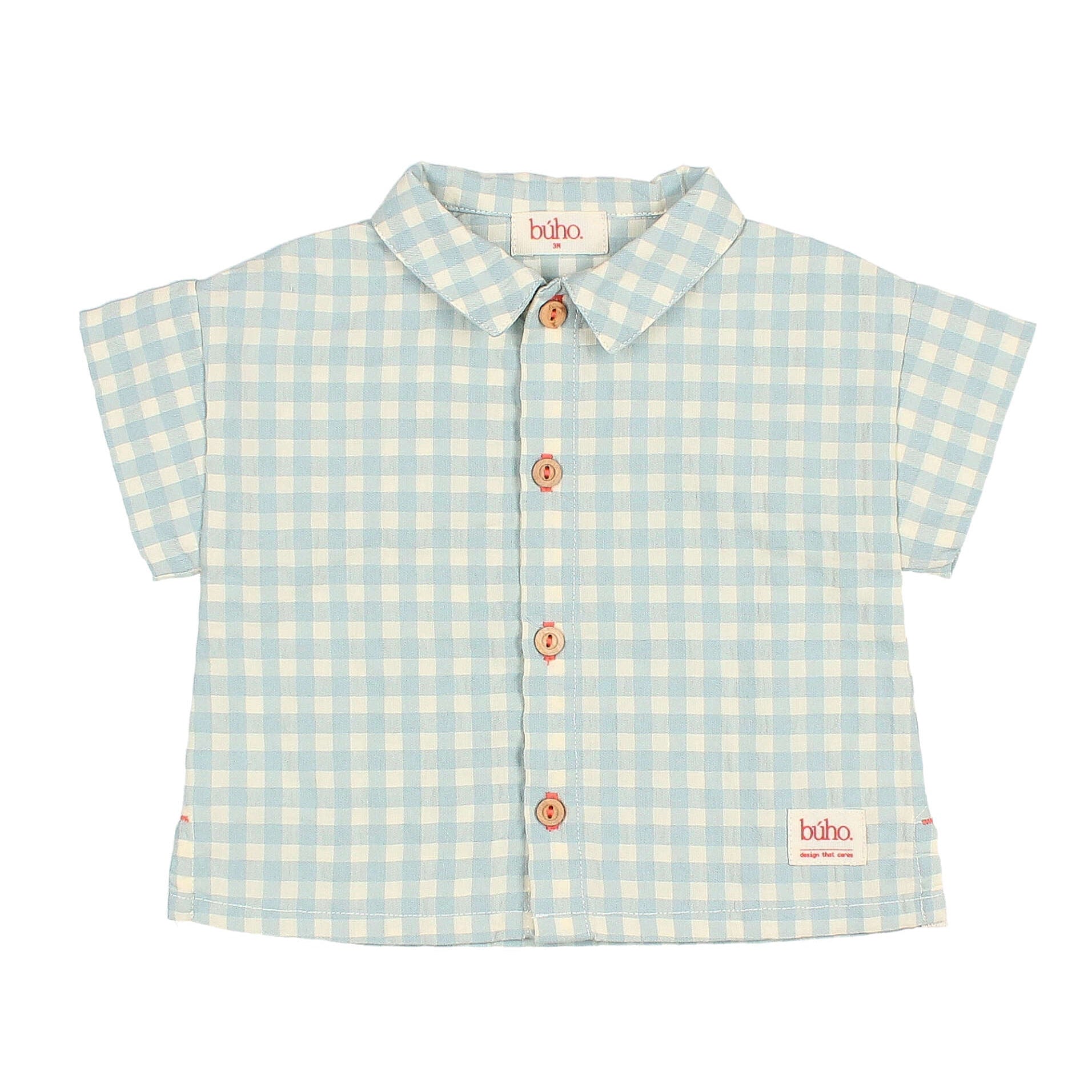 Entdecken Sie das charmante Hemd von Búho. Dieses kurzärmlige Karohemd aus leichtem Baumwoll-Seersucker bietet Komfort und Atmungsaktivität. Die Holzknöpfe und die dekorativen Details verleihen ihm einen einzigartigen Look, ideal für warme Tage.