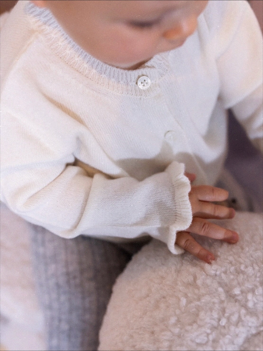 Este cárdigan de Papa Lobster está confeccionado con la mejor cachemira de doble capa, lo que proporciona una calidez excepcional. El cuello redondo y la tapeta de botones le aportan un toque de elegancia, mientras que el femenino volante en los puños le da un toque especial. Ya sea para el día a día o para ocasiones especiales, este versátil cárdigan es perfecto para cualquier temporada.