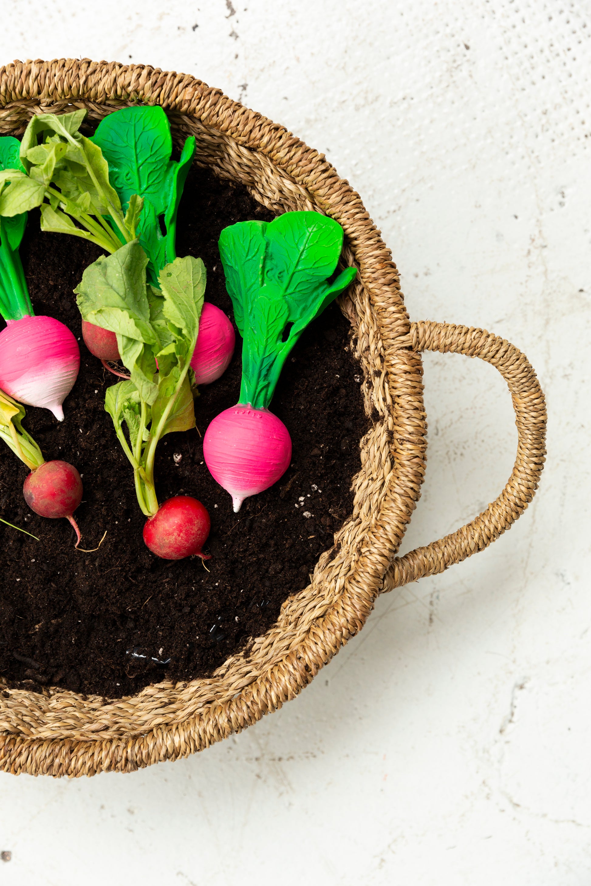 Mit Radieschen als Beißring wird das Zahnen für Babys angenehmer. Die realistische Textur fördert den Tastsinn und die Größe ist perfekt für kleine Hände. Hergestellt aus nachhaltigem Naturkautschuk und handbemalt mit natürlichen Farben, ist es auch als Bade- und Sensorikspielzeug geeignet. Eine gesunde Wahl für Babys und Kinder!