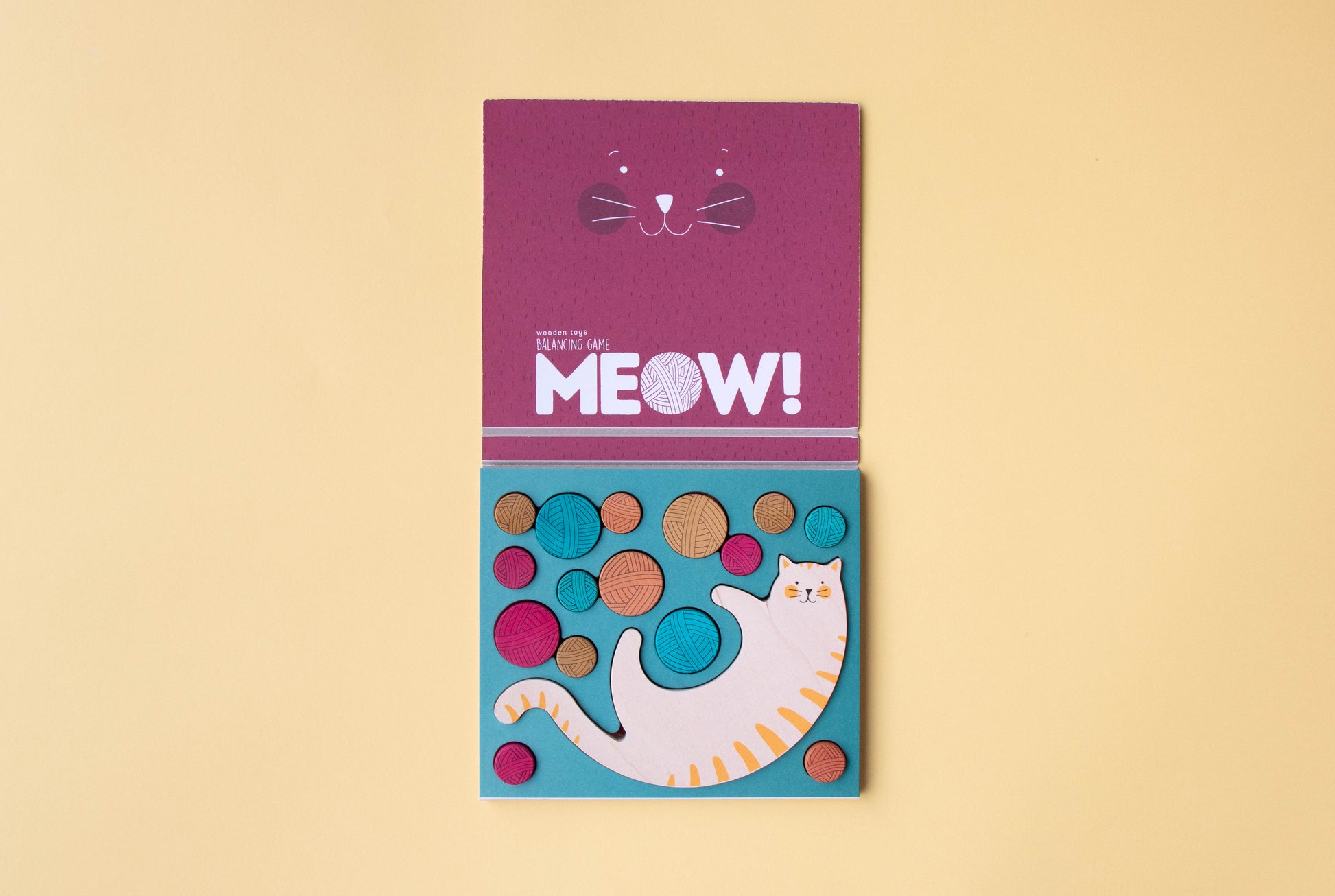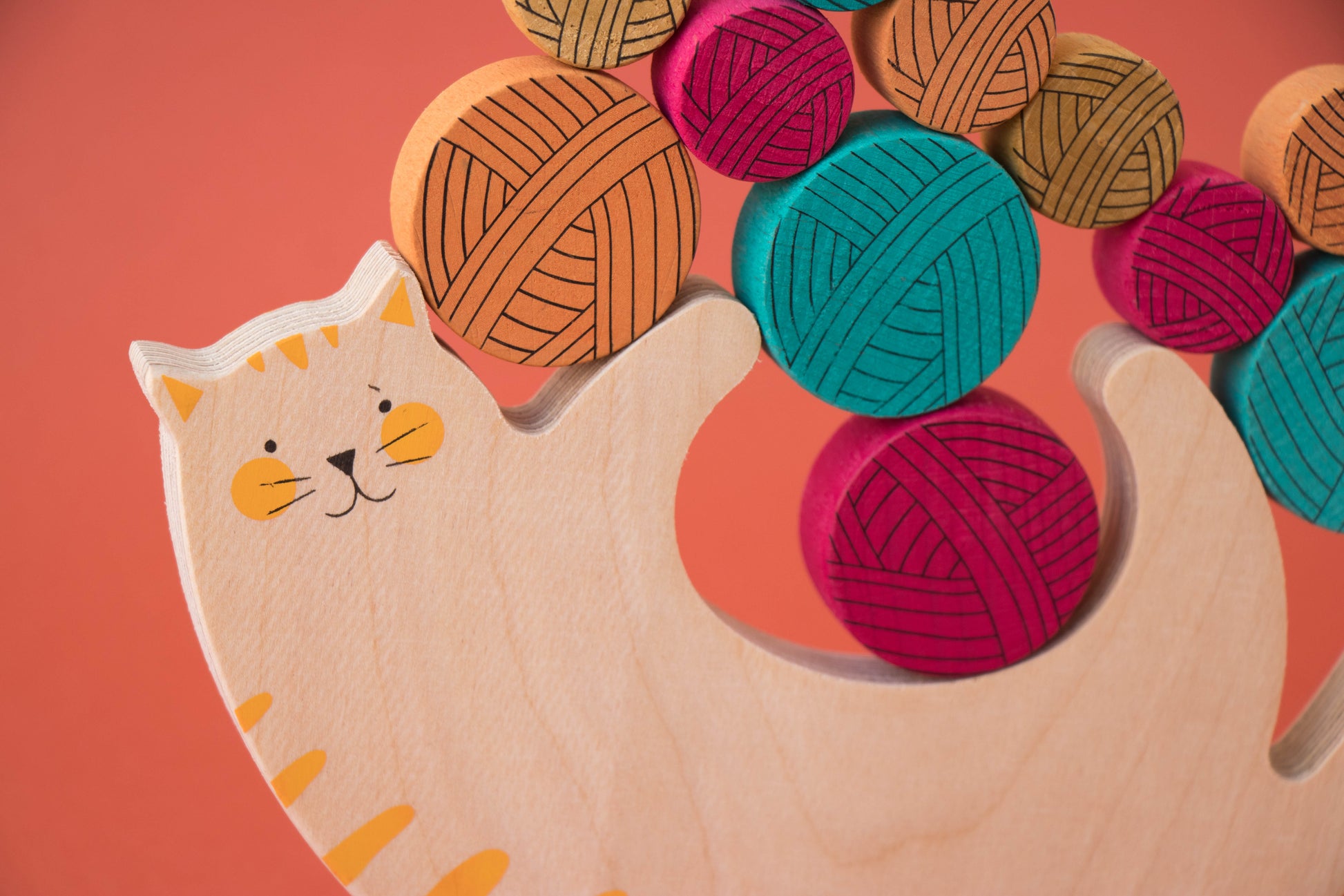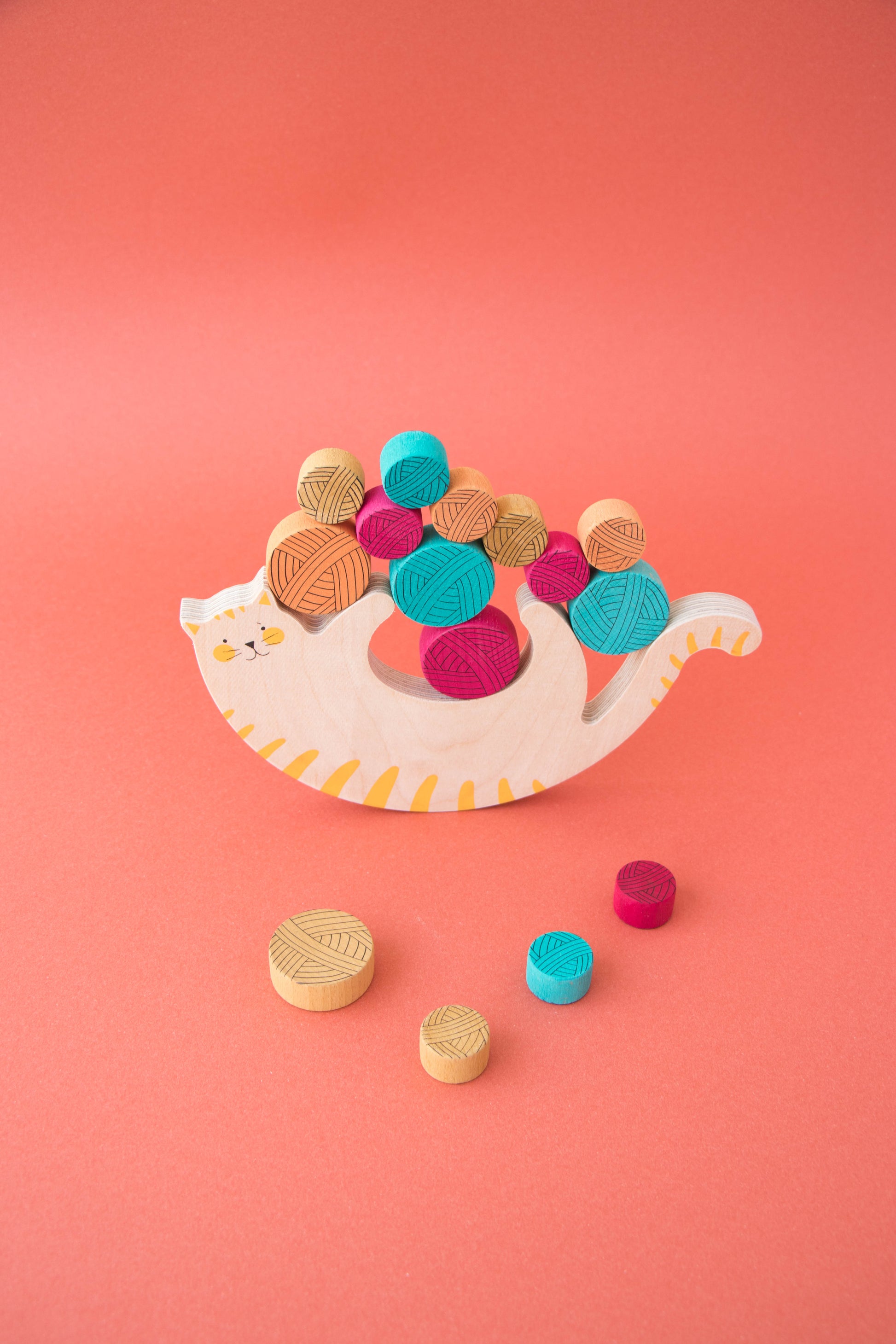 Spielen Sie mit diesem süßen Kätzchen und legen Sie alle Wollknäuel darauf, ohne dass sie herunterfallen. Ein Balancespiel für die ganze Familie! Handgefertigt aus Birkenfurnier- und Buchenholz und mit natürlichen Farben bemalt. Wer am geschicktesten ist, gewinnt.