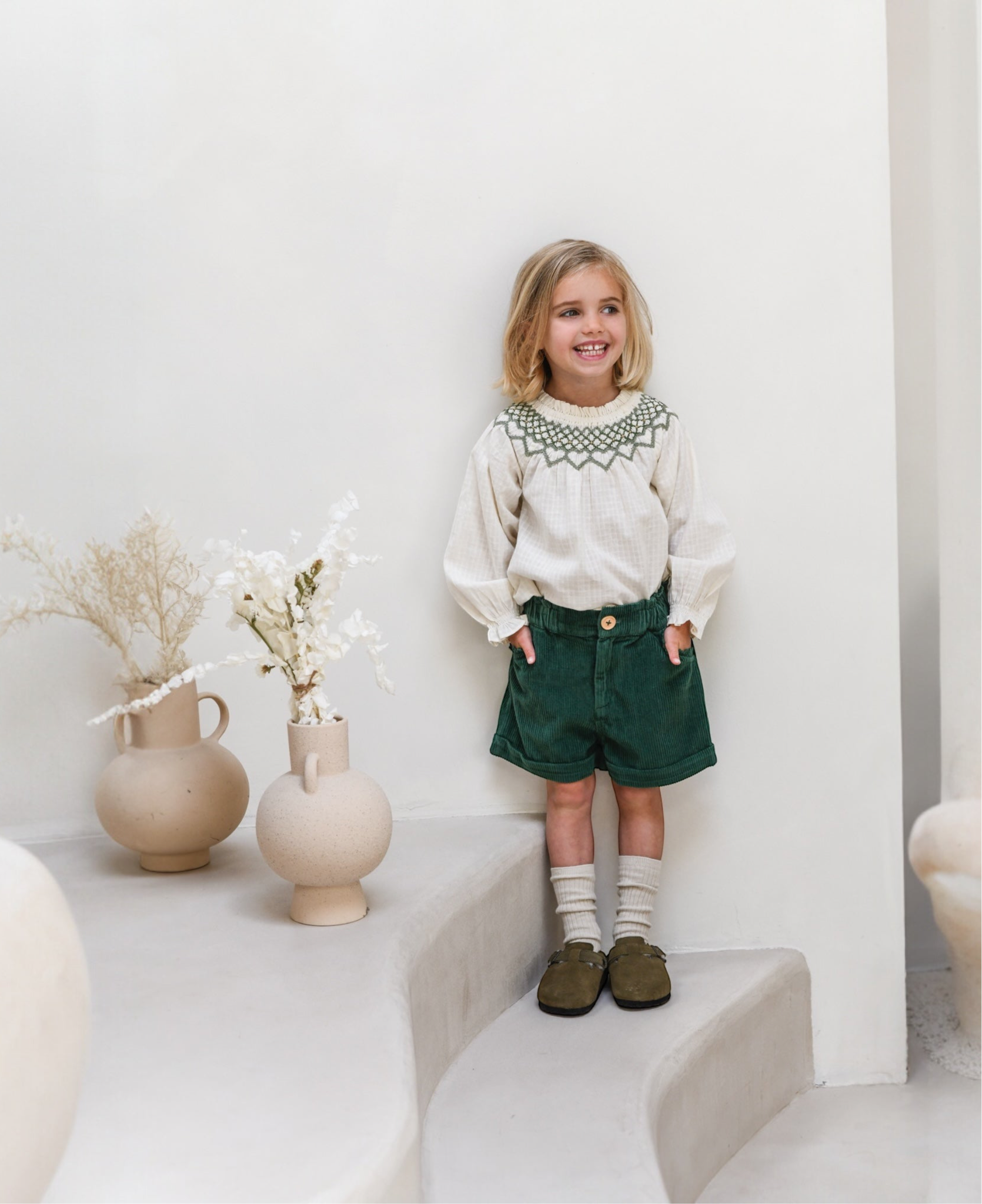 Verleihen Sie der Garderobe Ihres Kindes mit der Bluse von Bonheur du jour Paris eine elegante Note. Die Smokarbeit und die Knopfleiste auf der Rückseite machen diese Bluse zu einem besonderen Hingucker. Sie ist aus 100% Baumwolle gefertigt und lässt sich perfekt mit Jeans, Rock oder Cordhose kombinieren.