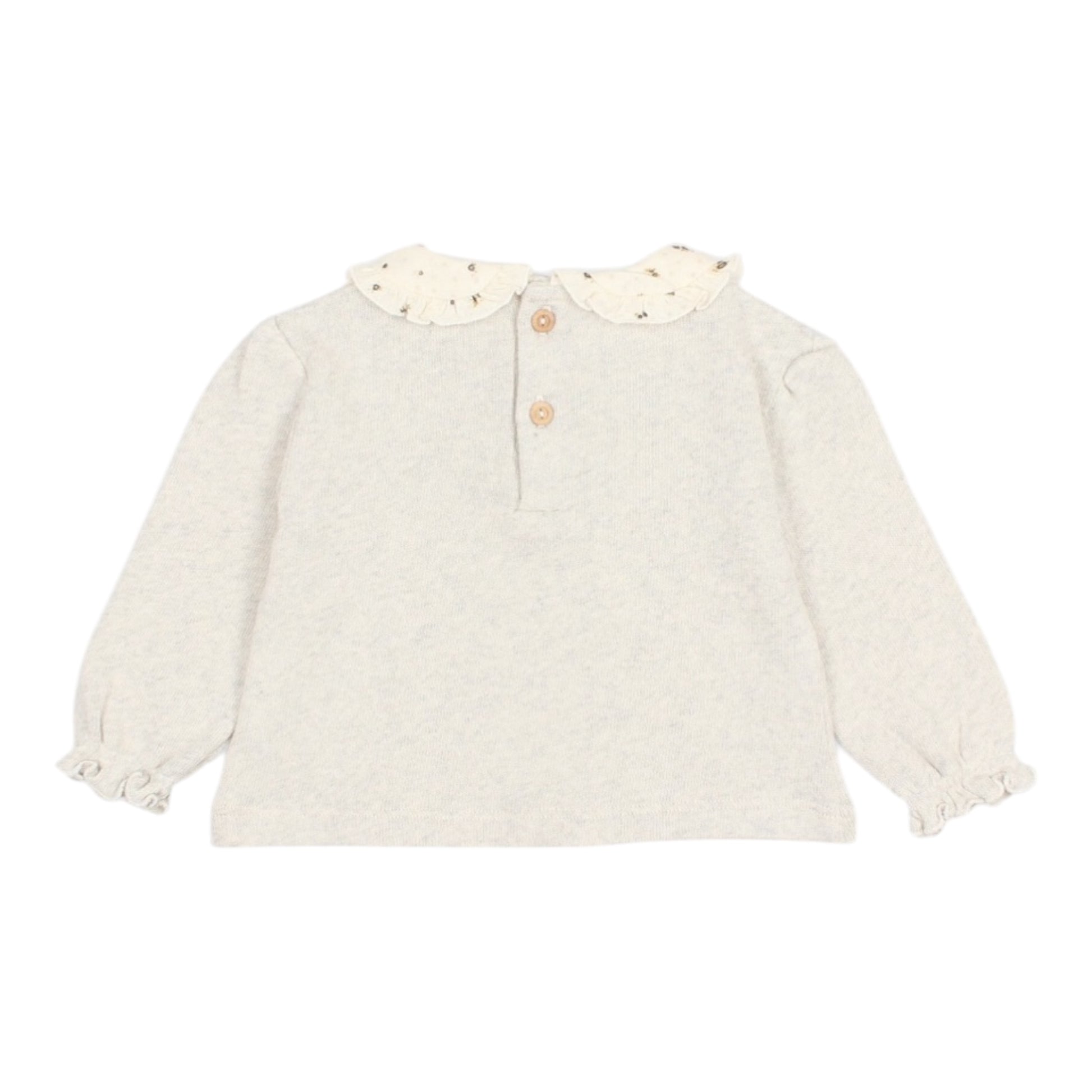 Unser Búho Blusen-Shirt für Babys und Minis besteht aus 100% superweicher Baumwolle und behält auch nach der Wäsche seine Weichheit. Mit einem zarten Kragen aus Musselinblumen und Grundfarbe grau/ off white. Eine praktischen Knopfleiste hinten und eine leichte A-Form sorgt für zusätzlichen Komfort.