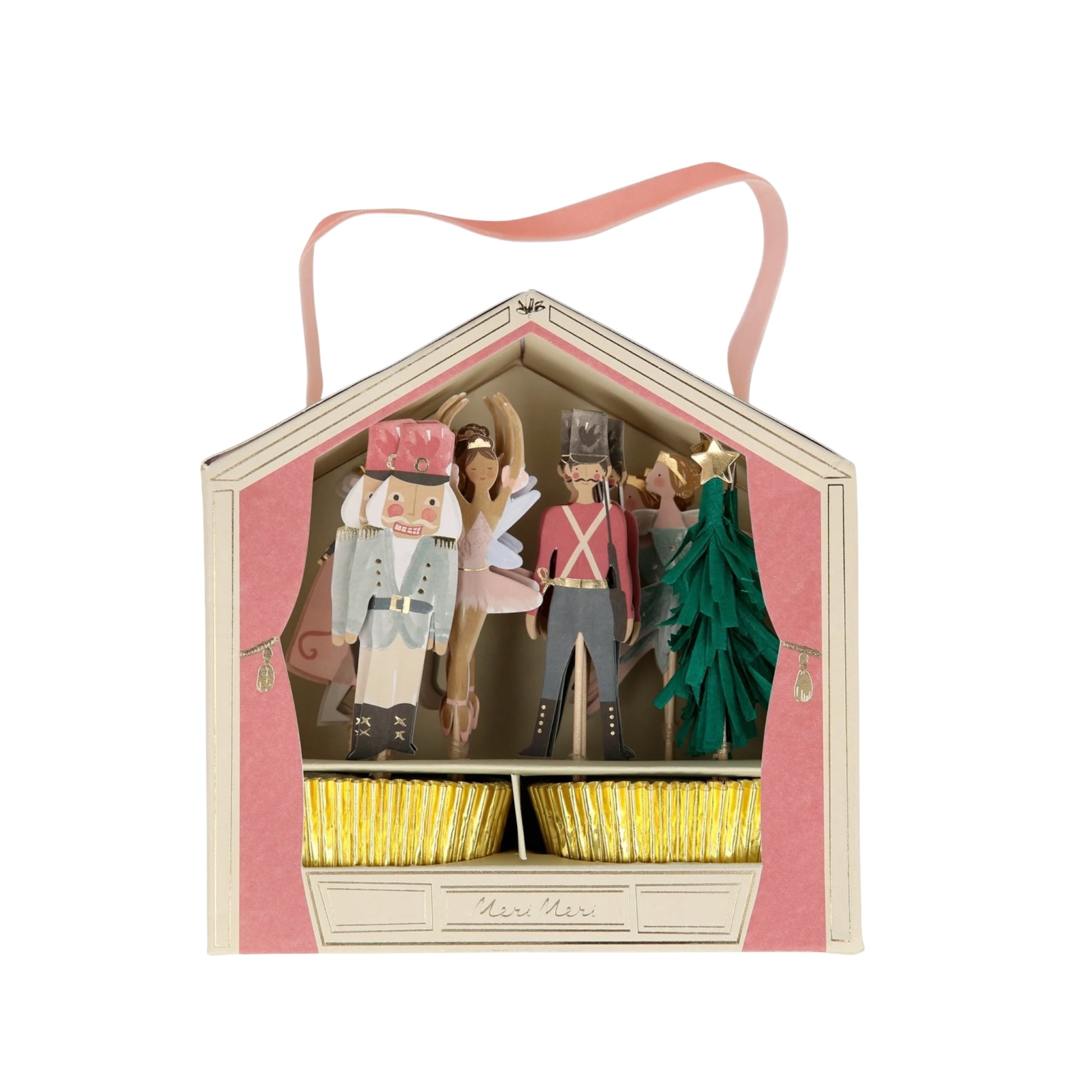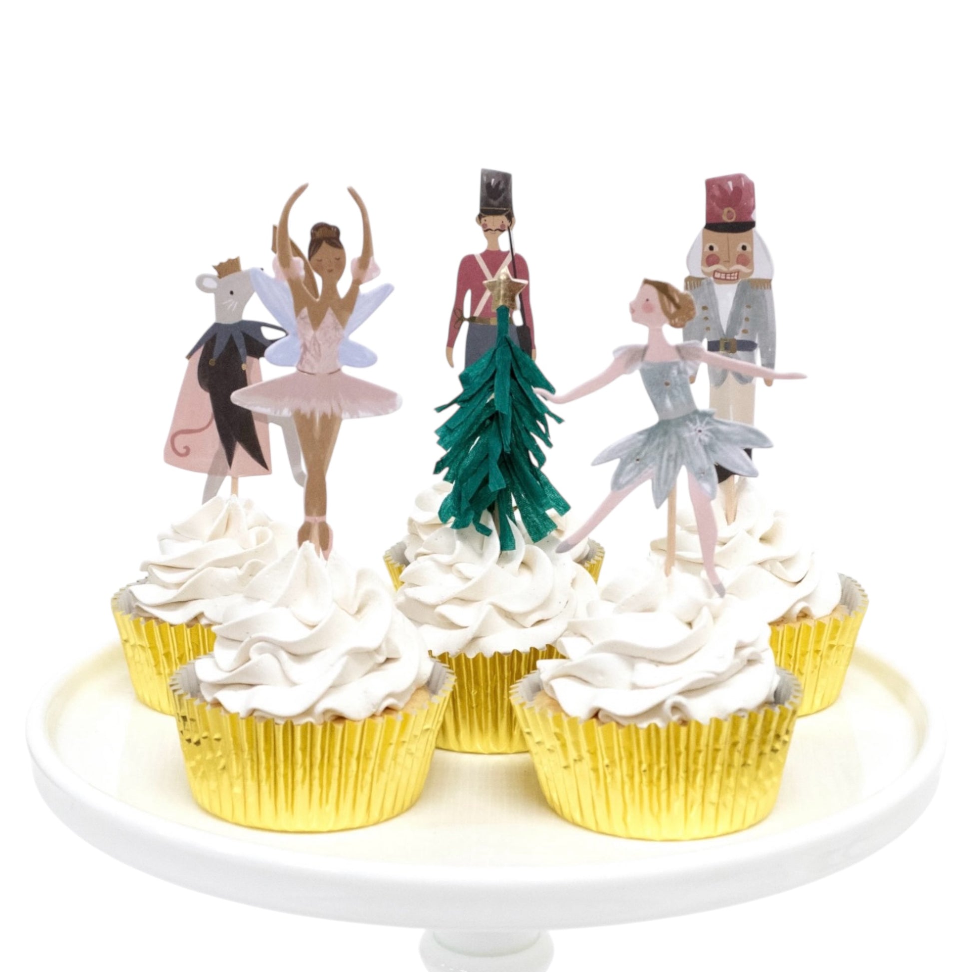 Die Cupcake "Nussknacker" von Meri Meri ist eine elegante und stilvolle Wahl für Ihre nächste Veranstaltung. Mit insgesamt 24 goldenen Folienförmchen und 24 toppers in 6 verschiedenen Designs, werden Ihre Cupcakes zu einem wahren Hingucker auf jedem Tisch. Die toppers werden auf Holzcocktailstäbchen präsentiert und in einer Box mit rosa Samtband geliefert. Perfekt für eine festliche Atmosphäre.