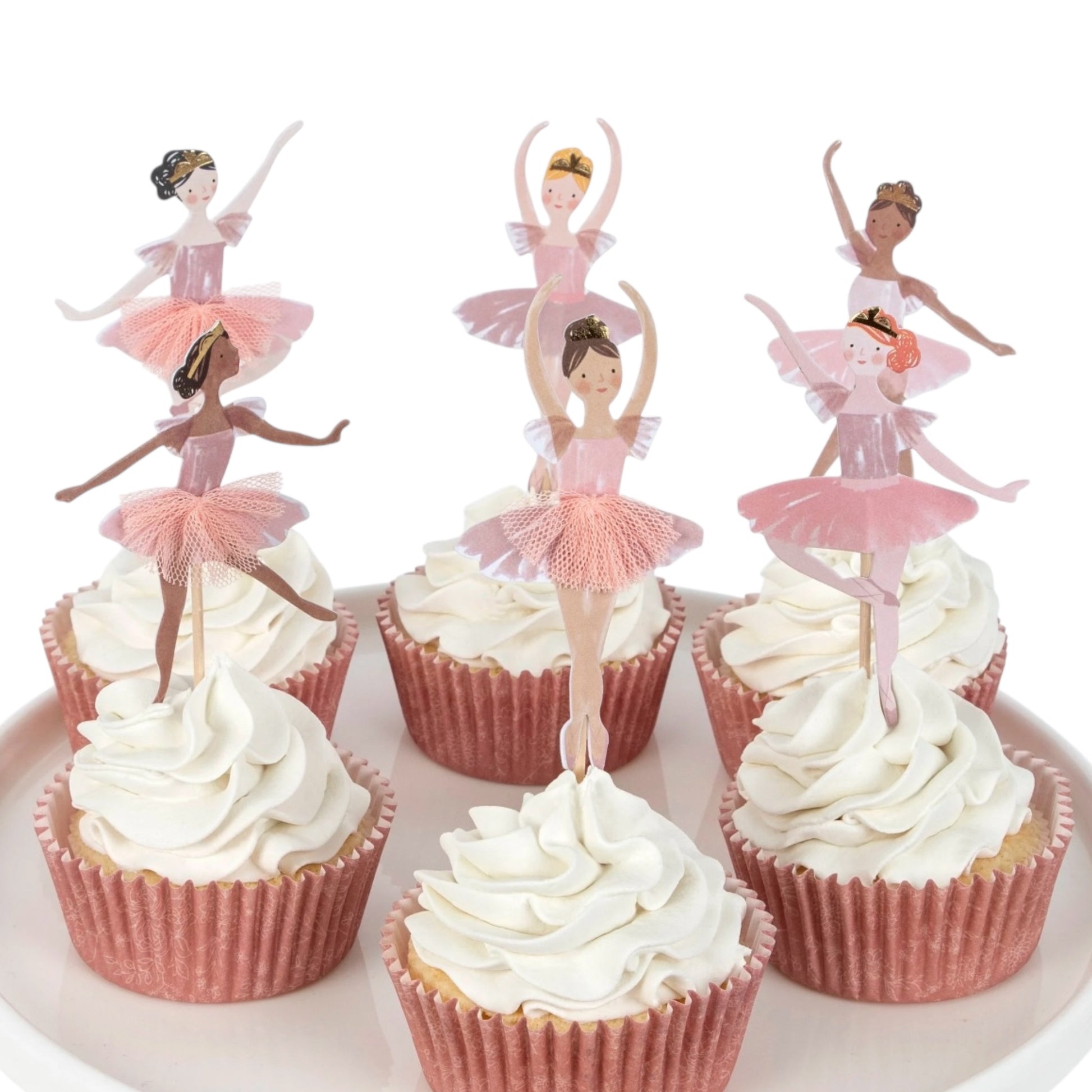Verwandeln Sie einfache Cupcakes in elegante Ballerina-Leckereien mit dem Cupcake Set "Ballerina" von Meri Meri. Die wunderschön gestalteten Verzierungen aus rosa Tüll und glänzenden Goldfoliendetails machen sie perfekt für eine Ballerina-Party. Inklusive 24 Toppern in 6 verschiedenen Designs und rosa gemusterten Cupcake-Förmchen für eine zauberhafte Präsentation. Perfekt für alle, die das Besondere lieben. Maße: 64 x 32 x 64 mm.