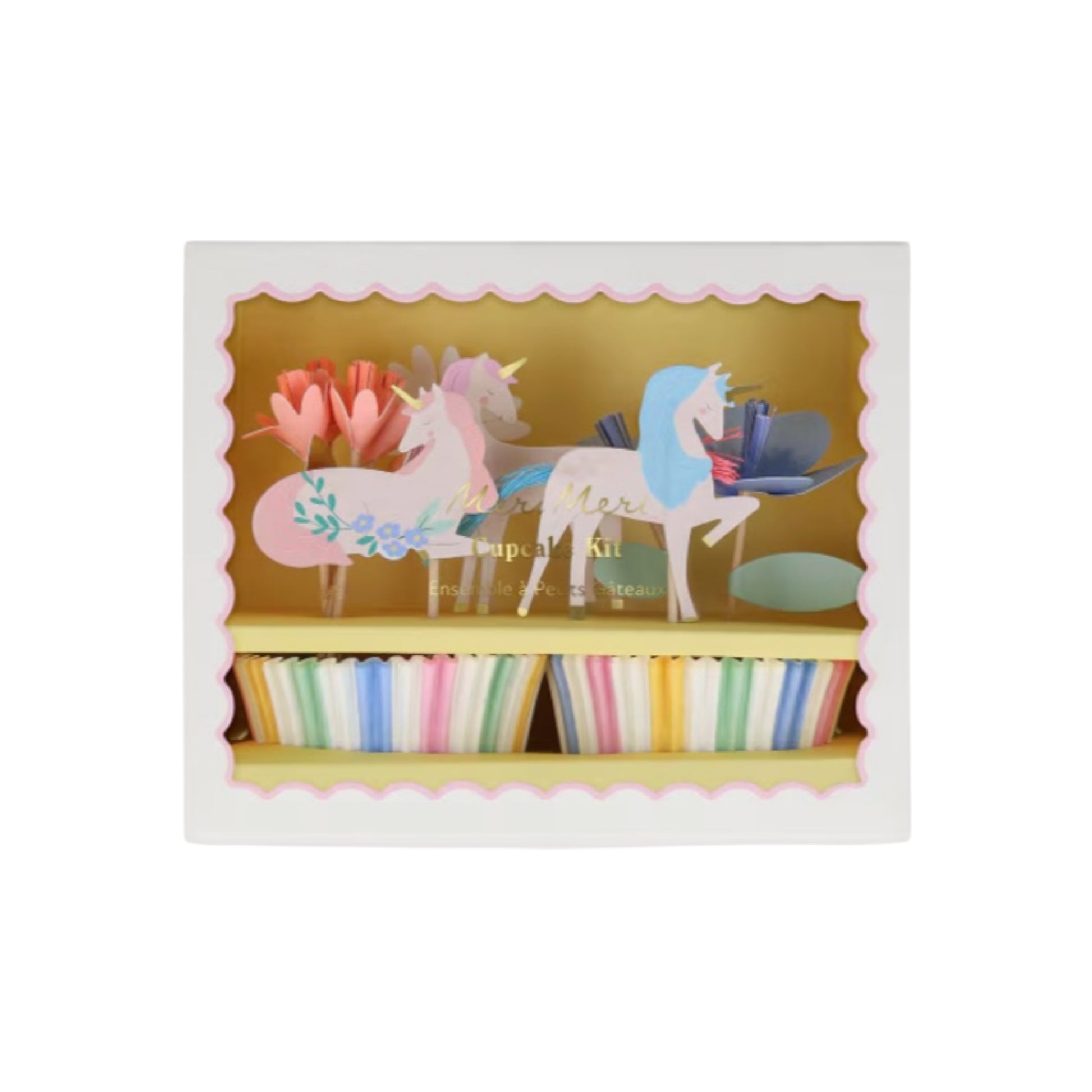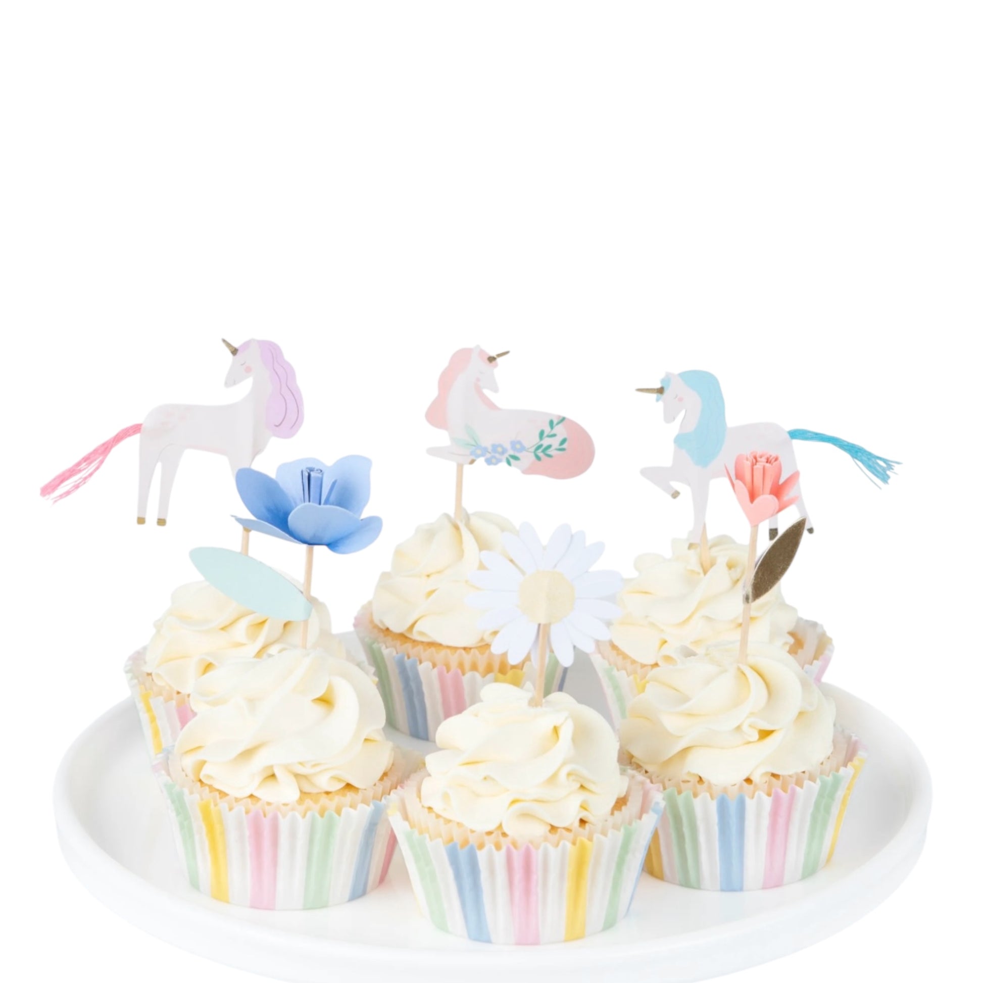 Verzaubern Sie Ihre Gäste mit dem Einhorn Cupcake Set von Meri Meri. Die perfekte Kombination aus Einhörnern und Blumenwiesen macht Ihre Party zu einem magischen Erlebnis. Das Set umfasst 24 mit Goldfolie verzierte Toppers und pastellgestreifte Cupcake-Hüllen. Einfach die Holzstäbchen befestigen und die Toppers in die Cupcakes stecken - für eine zauberhafte Cupcake-Centerpiece bei Ihrer Einhorn- oder Prinzessinnenparty. Verpackt in einer wunderschön gestalteten Box mit Blumenmotiven und Goldfoliendetails.