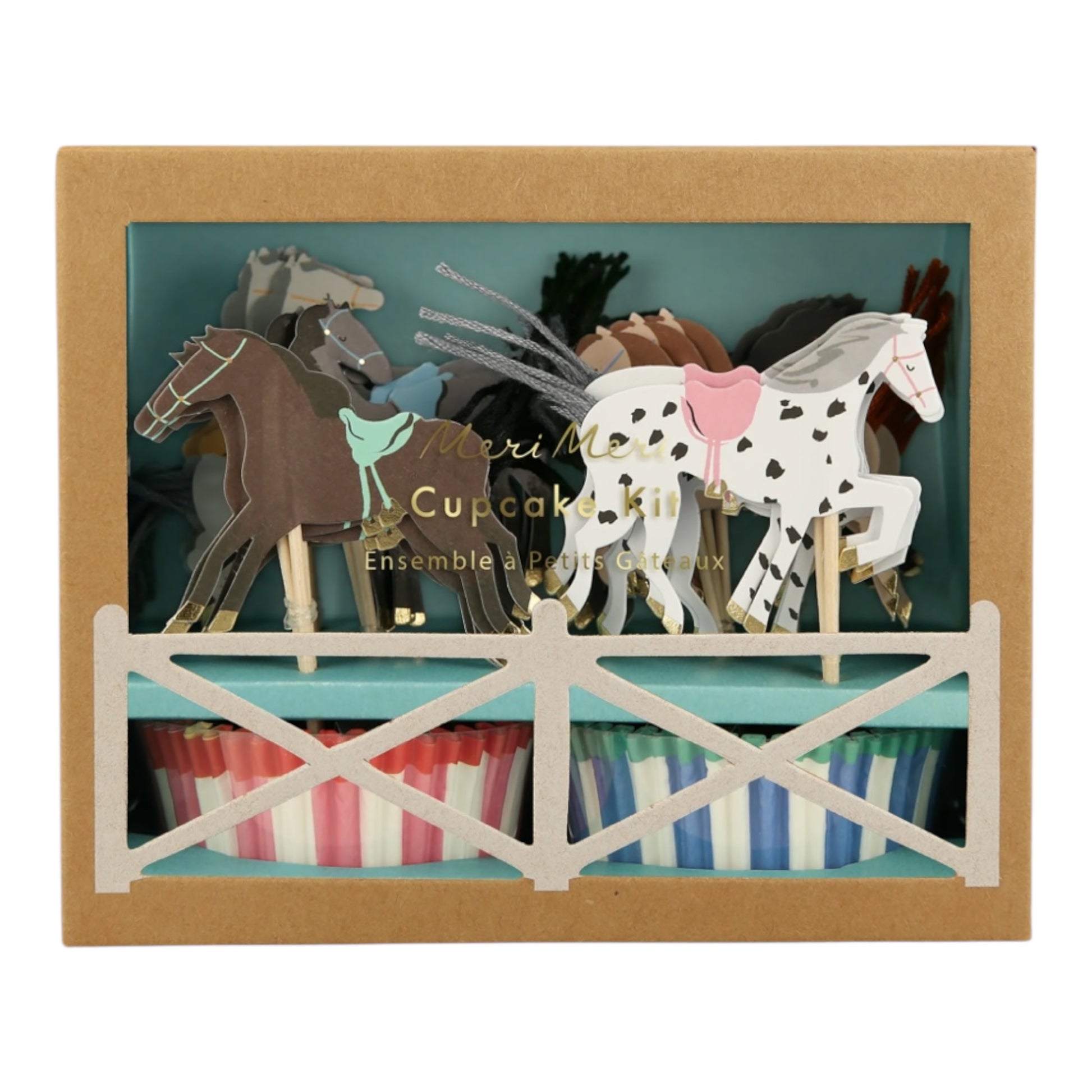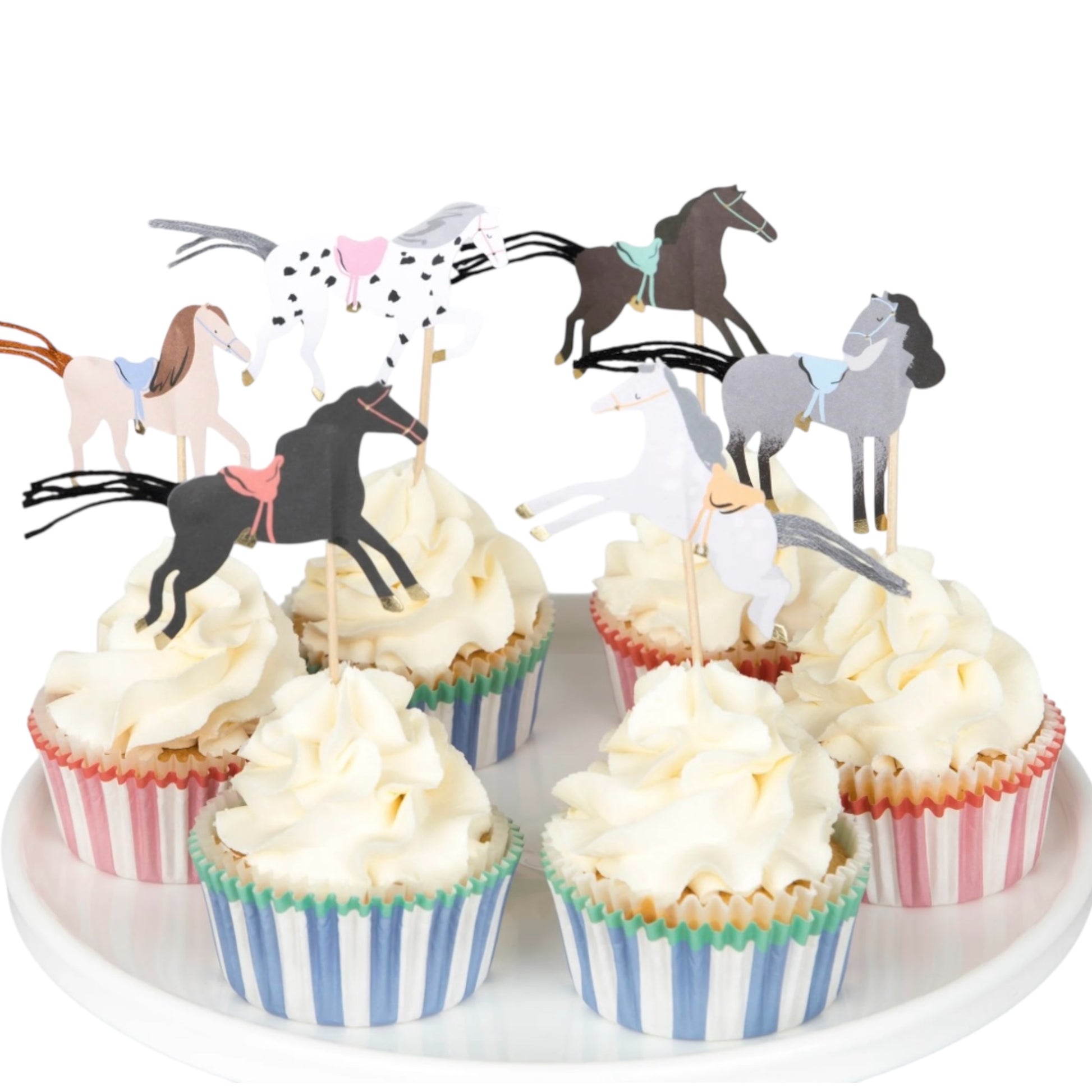 Dieses Cupcake-Set macht Sie zum Cupcake-Champion. Mit raffiniert gestalteten Pferdeaufsätzen und Quastenschwänzen, glänzenden Goldfoliendetails und gestreiften Cupcake-Förmchen ist es perfekt für eine Pferdeparty oder als Geschenk. Inklusive 24 Toppern in 6 Designs und Cocktailspießen für einfaches Einstecken. Maße: 64 x 32 x 64 mm.
