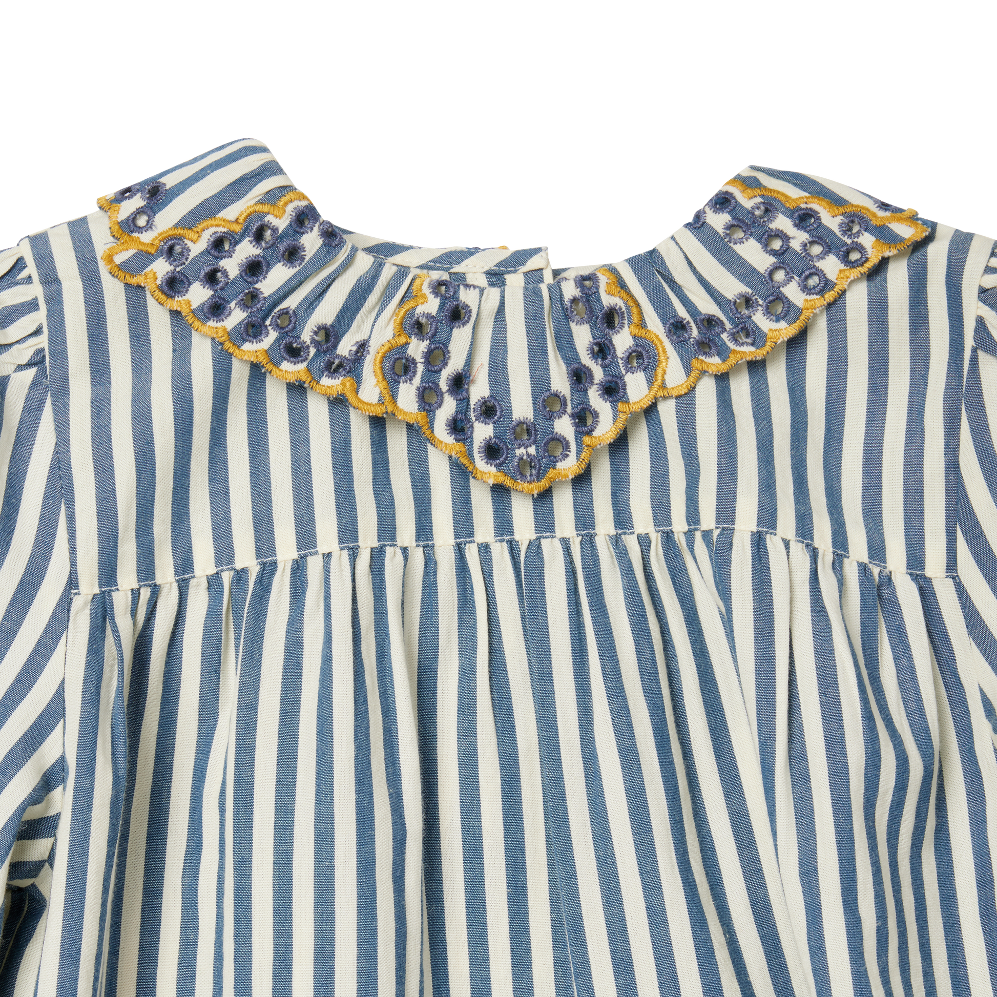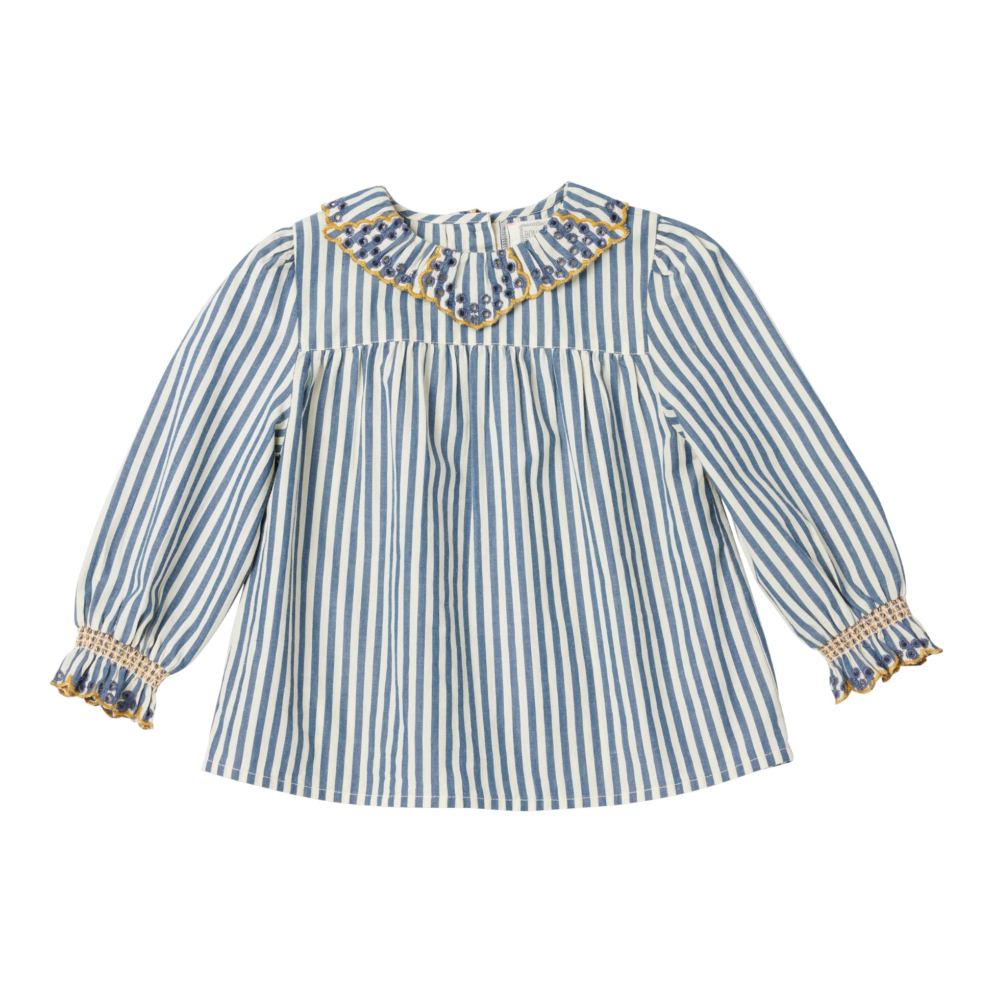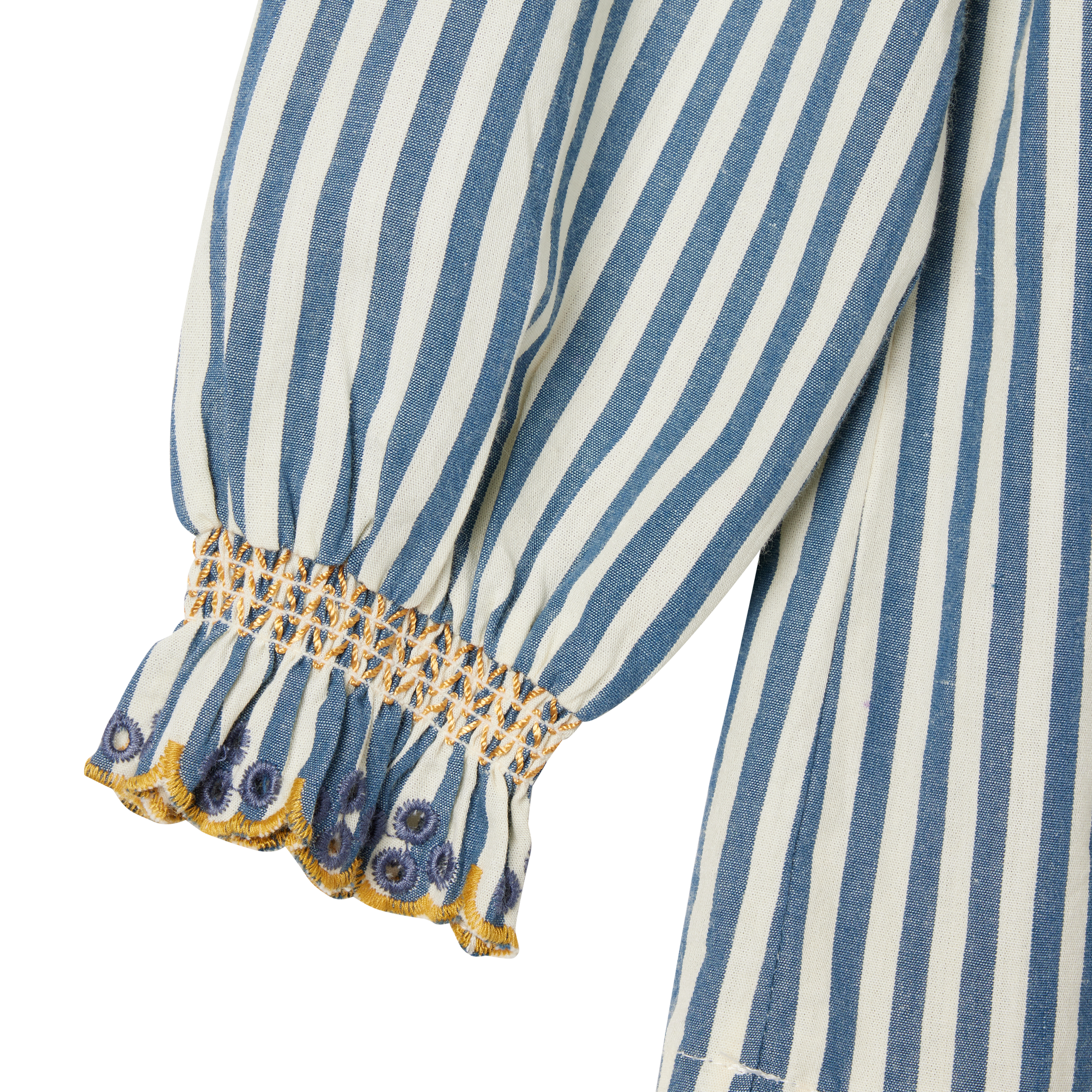 Entdecke die Gestreifte Bluse von Bonheur du jour in den Farben Raye Bleu/ Blanc. Die zauberhafte Stickerei aus Lochmuster am Kragen und an den gesmokten Ärmelabschlüssen machen diese Bluse zu einem besonderen Hingucker. Hergestellt aus 100% Baumwolle für angenehmen Tragekomfort.