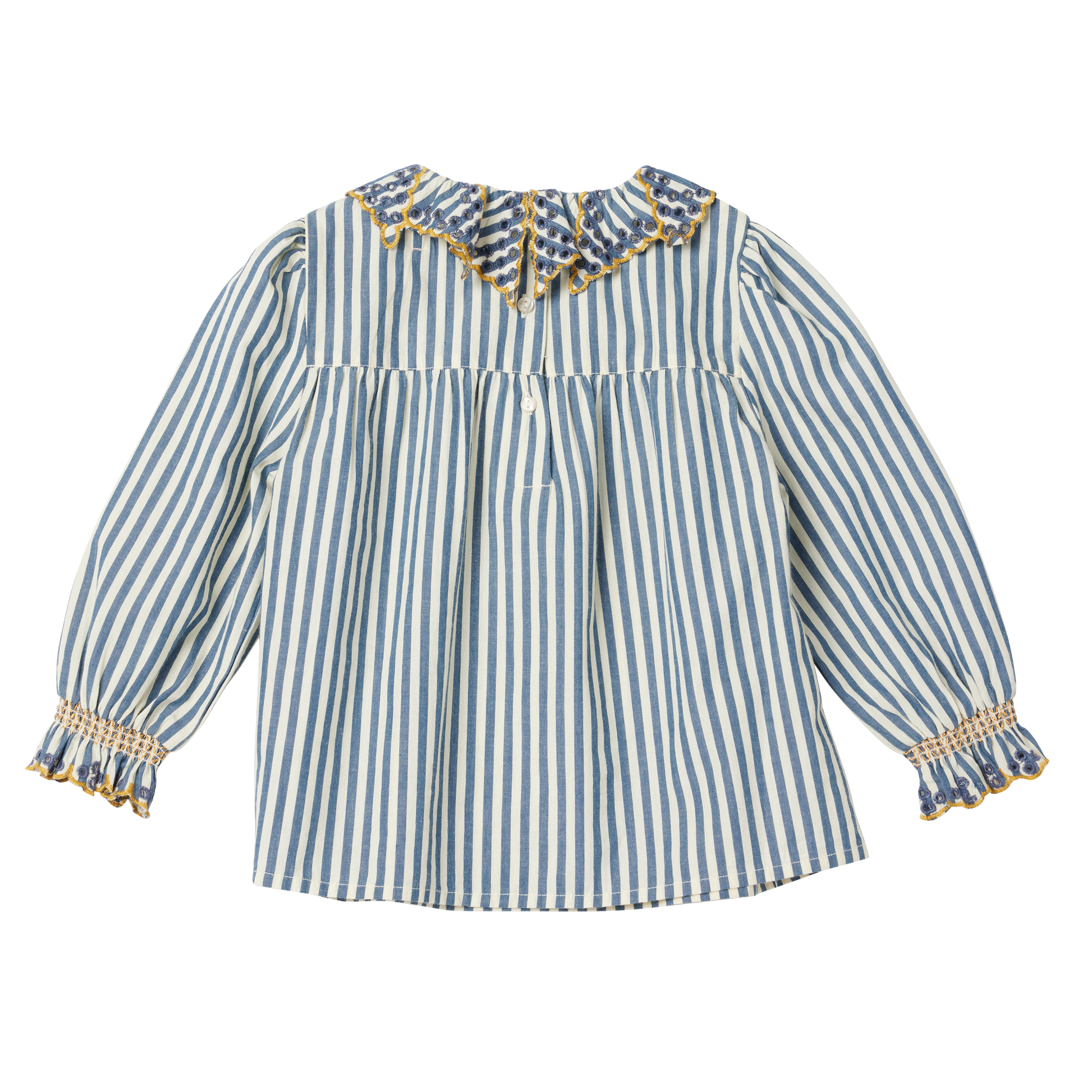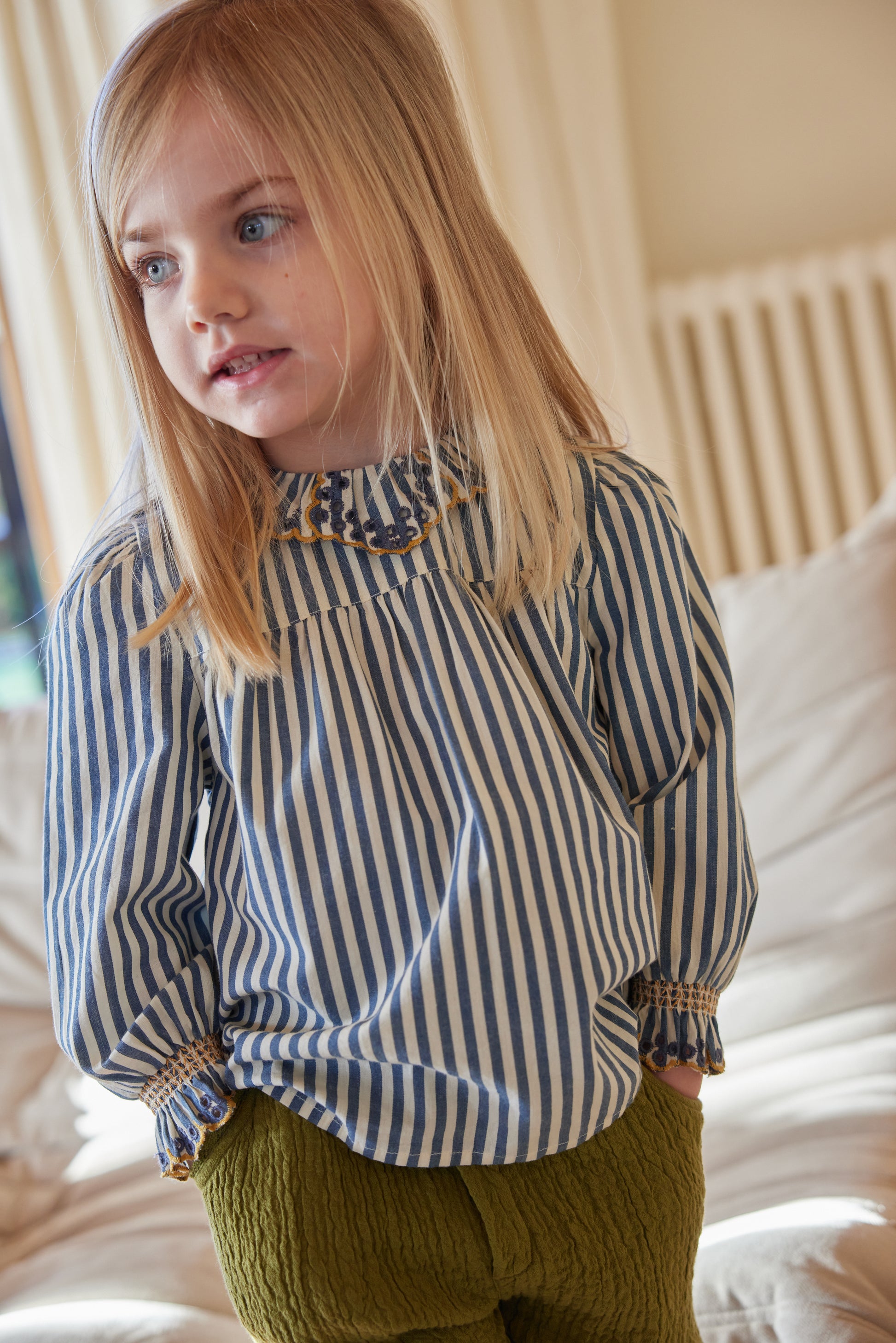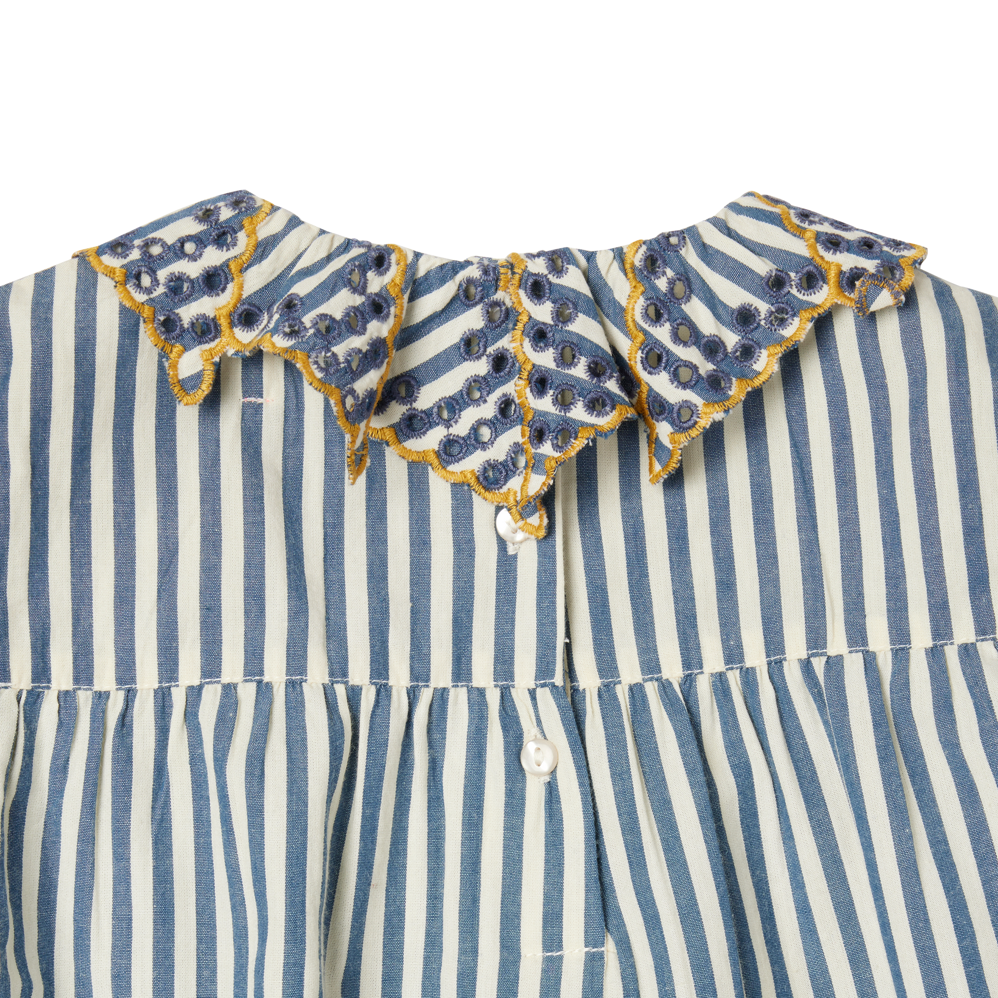 Entdecke die Gestreifte Bluse von Bonheur du jour in den Farben Raye Bleu/ Blanc. Die zauberhafte Stickerei aus Lochmuster am Kragen und an den gesmokten Ärmelabschlüssen machen diese Bluse zu einem besonderen Hingucker. Hergestellt aus 100% Baumwolle für angenehmen Tragekomfort.