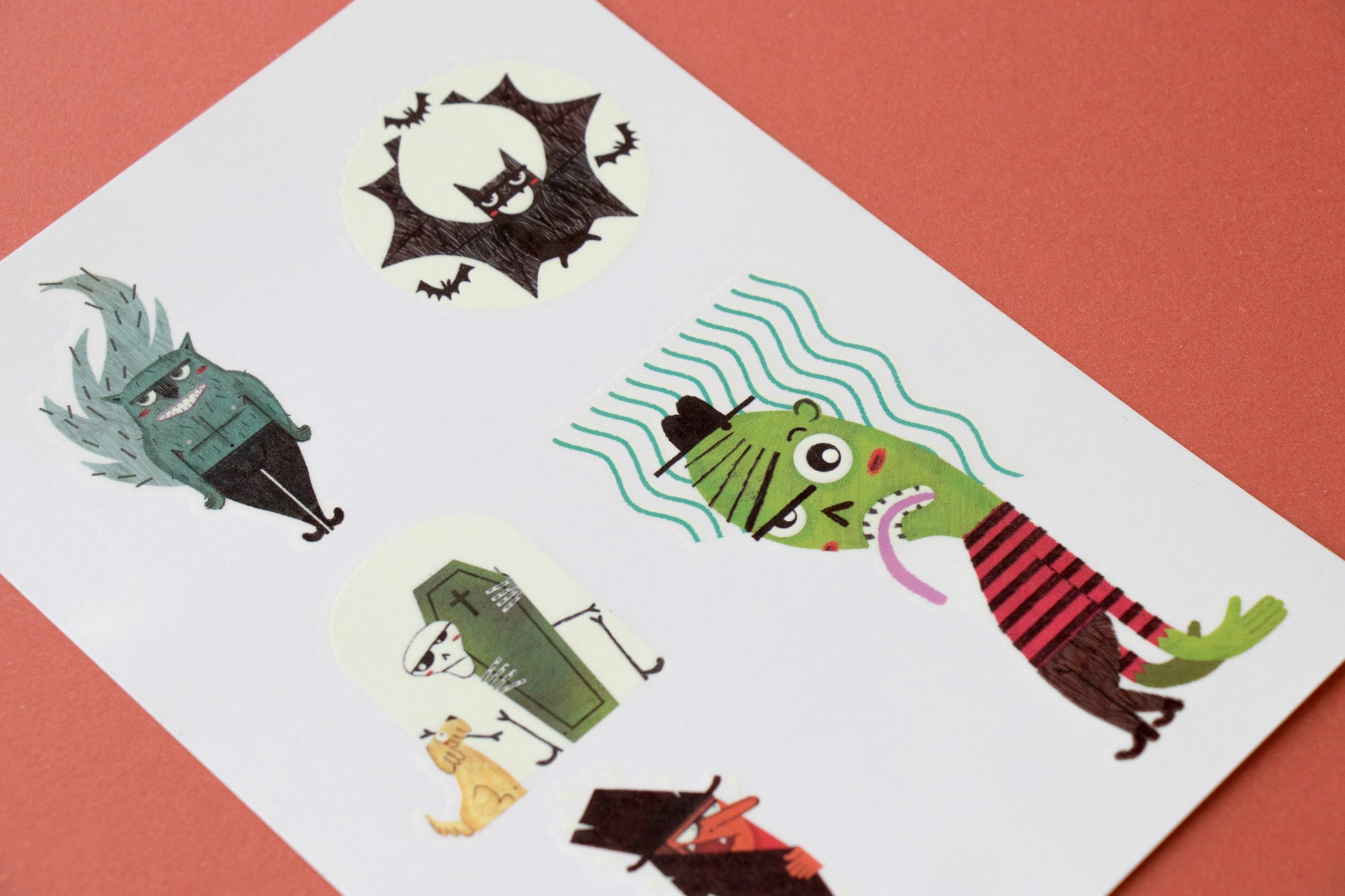 Verziert euer Kostüm mit den Grusel Tattoos von Londji! Zehn furchteinflößende temporäre Tattoos von Vampiren, Frankensteins, Monstern und mehr. Sicher, lustig und ungiftig. Perfekt für kleine Halloween-Fans!