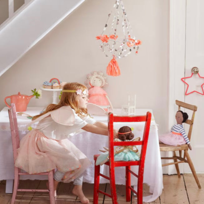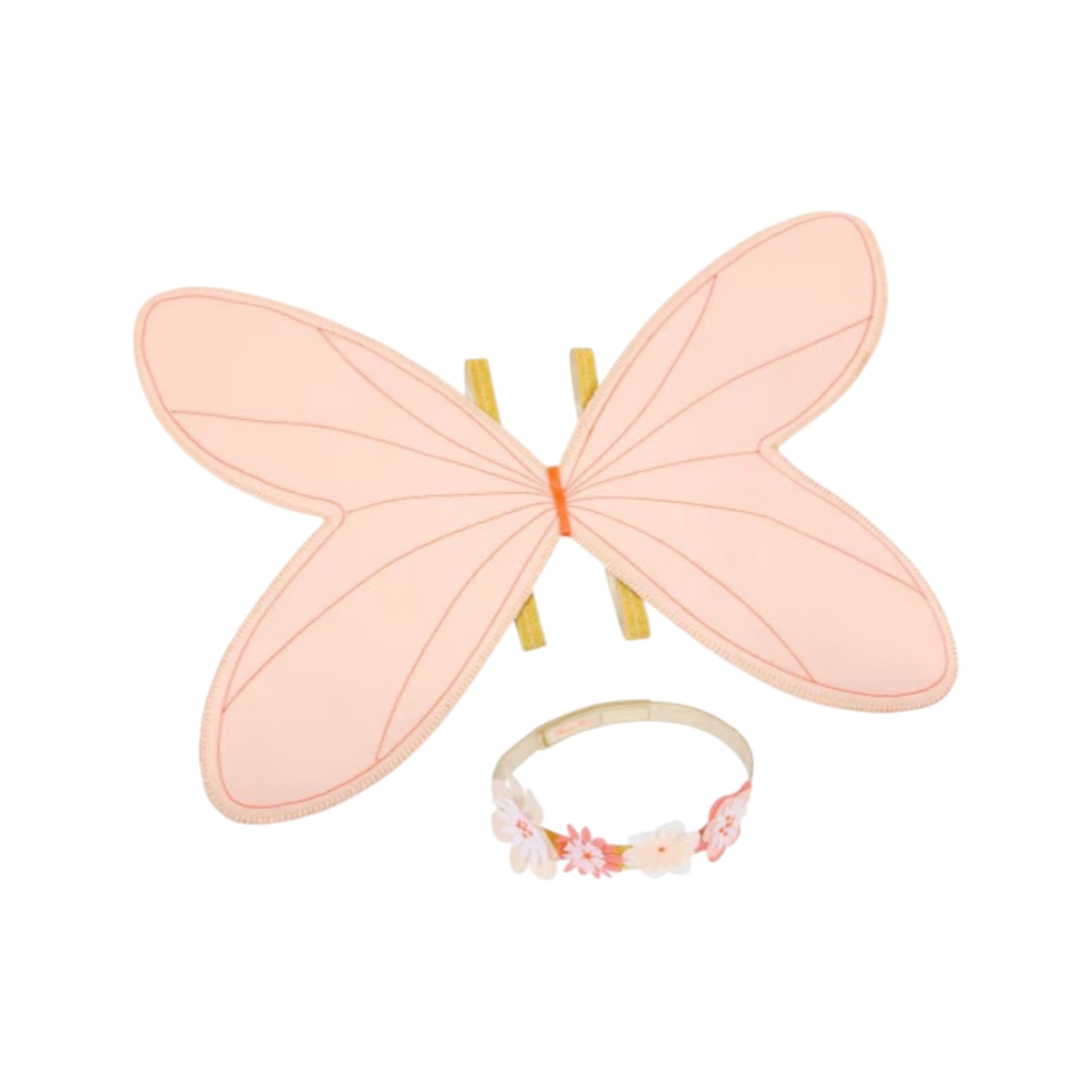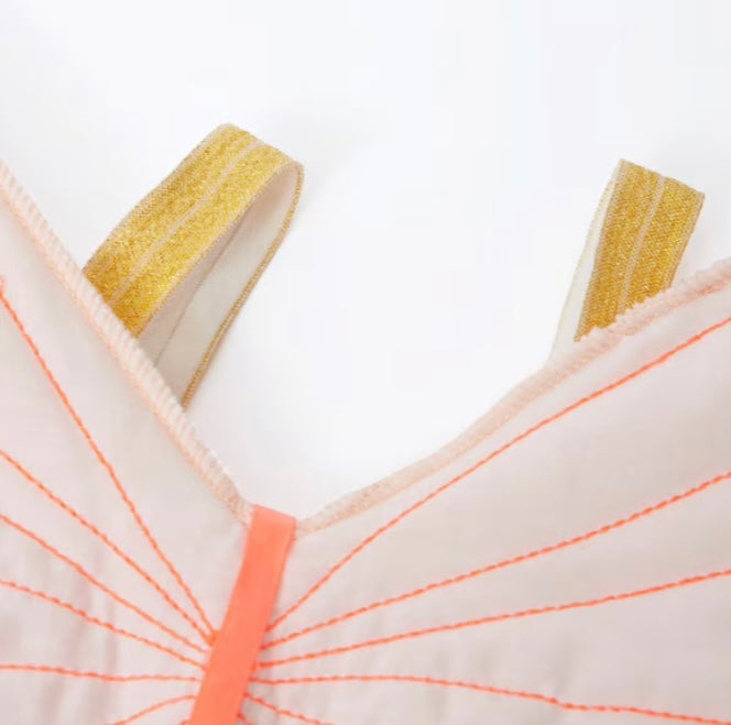 Das Kostüm Fee von Meri Meri ist ideal für kleine Kinder im Alter von 3-6 Jahren geeignet. Die Flügel sind aus pfirsichfarbener Baumwolle gefertigt und haben goldene elastische Riemen für einen bequemen Sitz. Das Set beinhaltet außerdem ein Blumen-Stirnband mit Klettverschluss und ist mit goldenem und neonfarbenem Faden verziert, was einen stilvollen Effekt erzeugt. Das Kostüm wird in einer bezaubernden Kordelzugtasche geliefert.