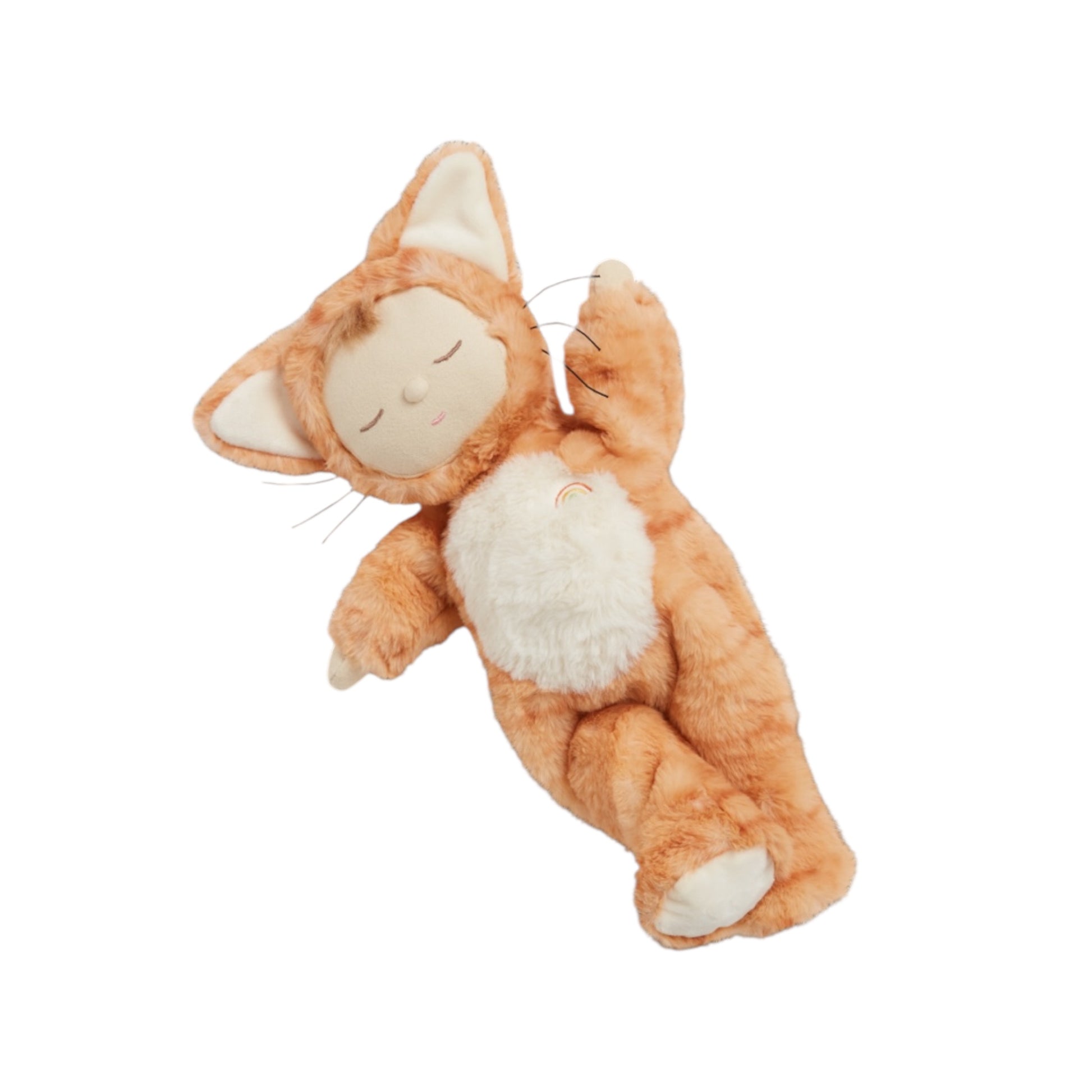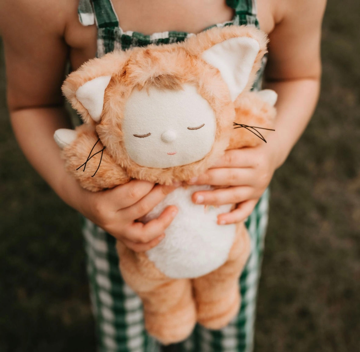 Kuschel-Katze von Olliella ist eine perfekte erste Puppe für dein Baby ab der Geburt. Mit einer Größe von ca. 31 cm ist sie extrem weich und vollständig beweglich, ideal zum Kuscheln und Spielen. Die Puppe hat aufgestickte, schlafende Augen und eine süße Knubbelnase, sowie eine kleine Regenbogen-Stickerei auf dem Herzen. Hergestellt ist sie aus einem kuscheligen Plüschanzug, der nicht abnehmbar ist, und einem leichten Gewicht. Das Gesicht und die Hände bestehen aus 100% Baumwolle, der Anzug aus 100% Polyester und die Füllung aus 50% Recyceltes Polyester und 50% Kunststoff-Pellets. Für die richtige Pflege empfehlen wir eine kalte Schonwäsche im Wäschesack.
