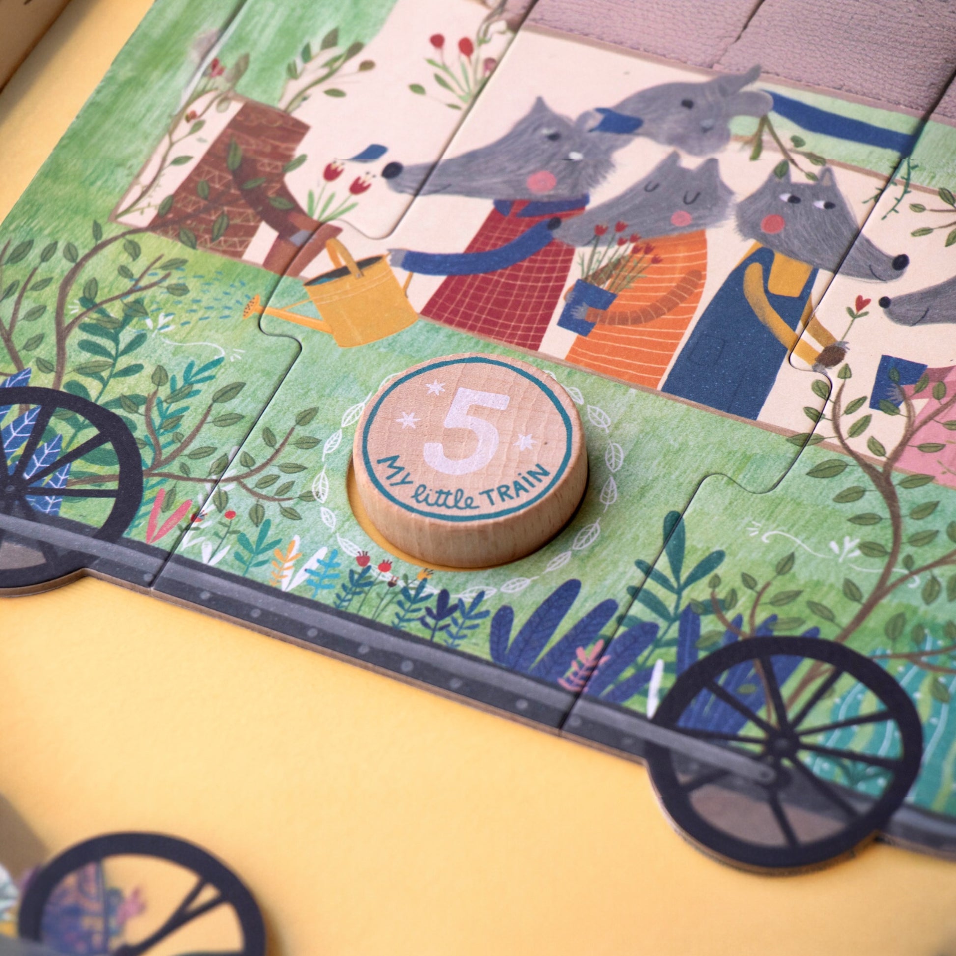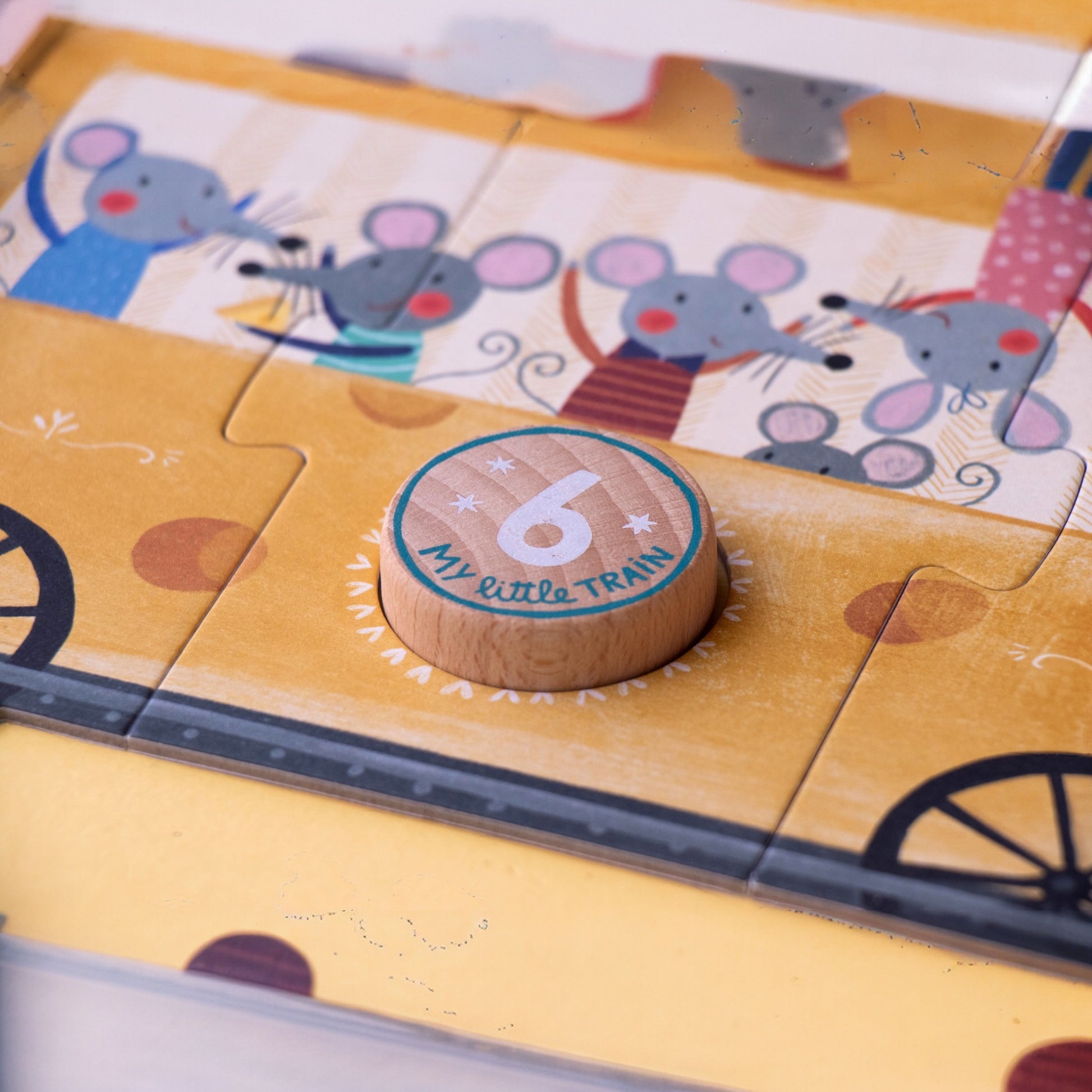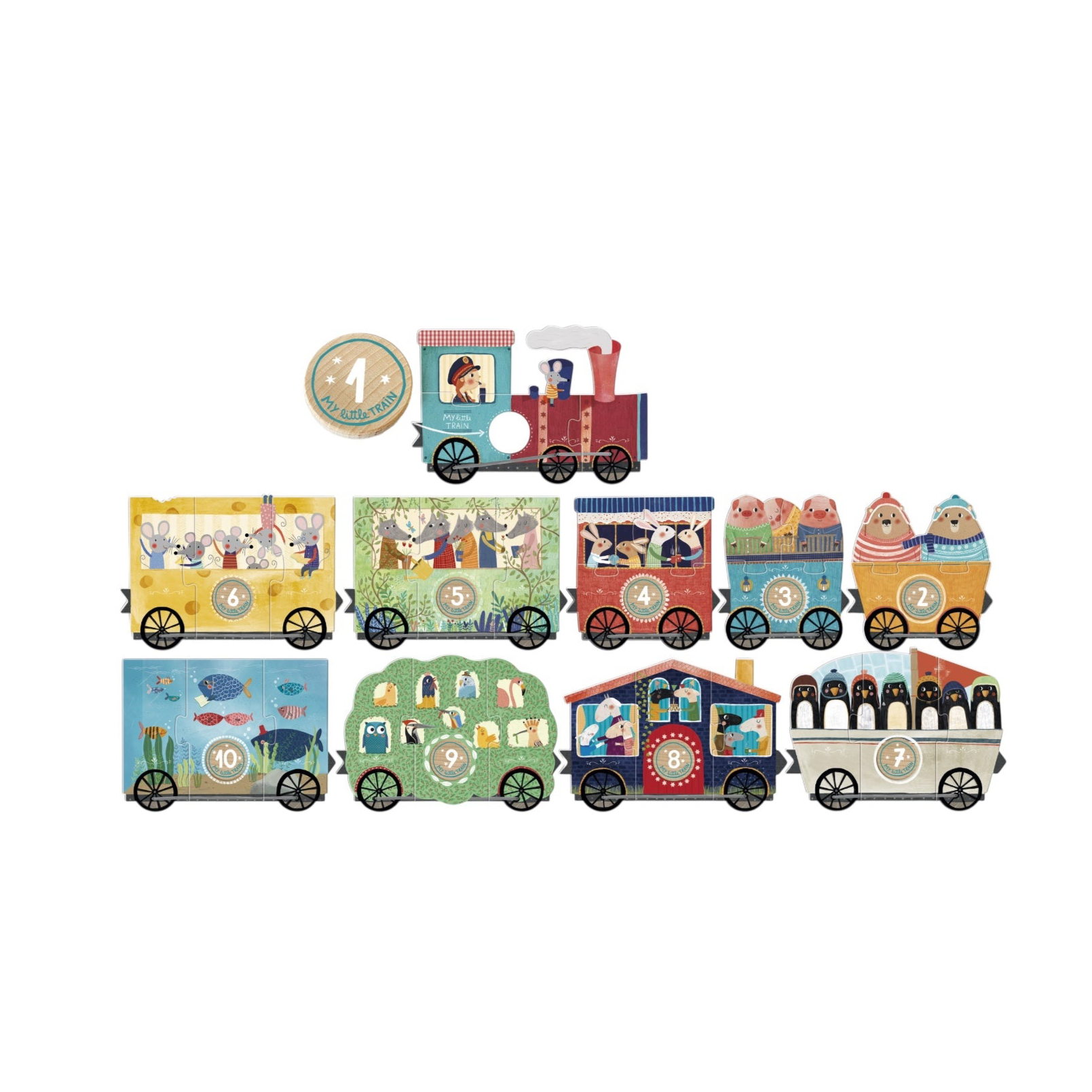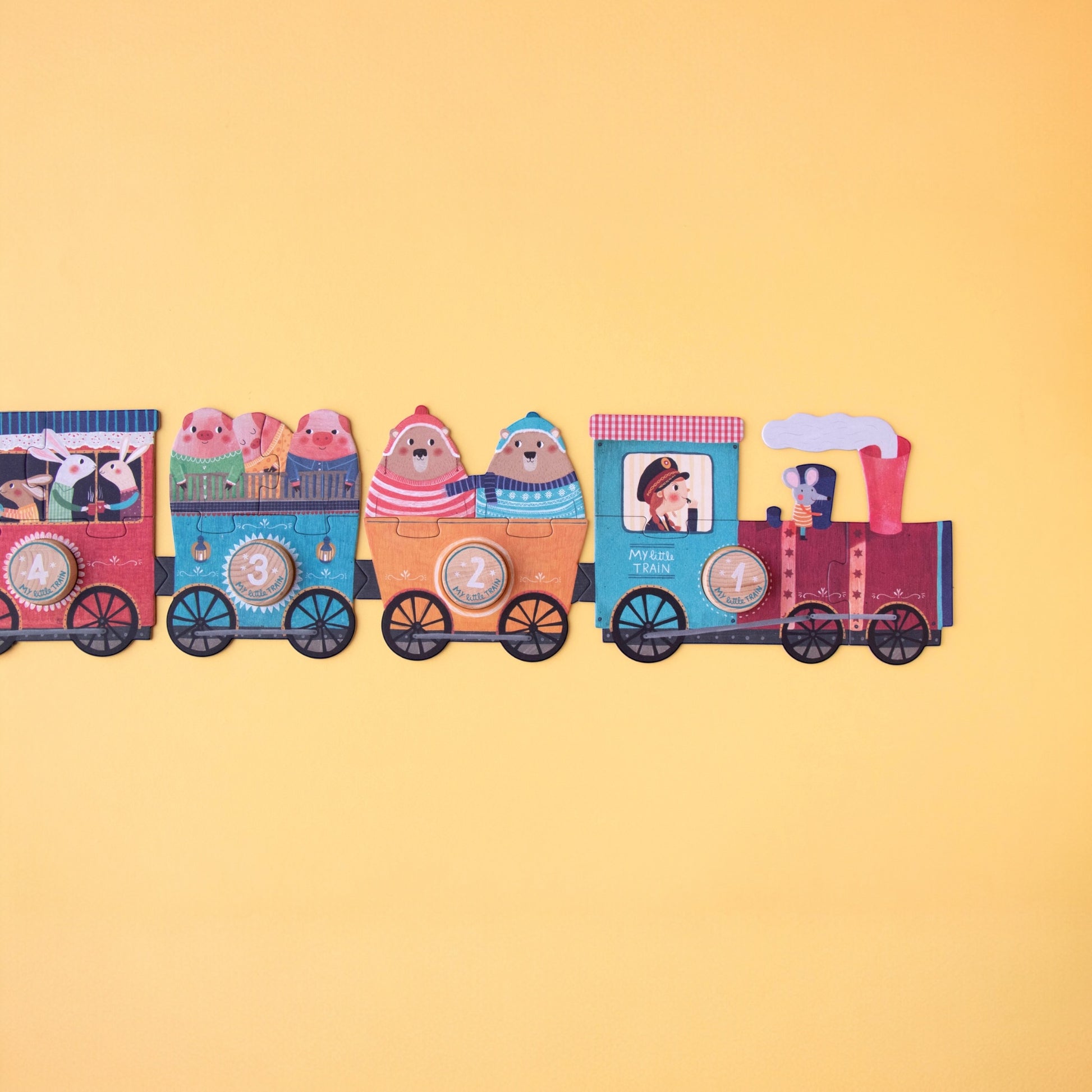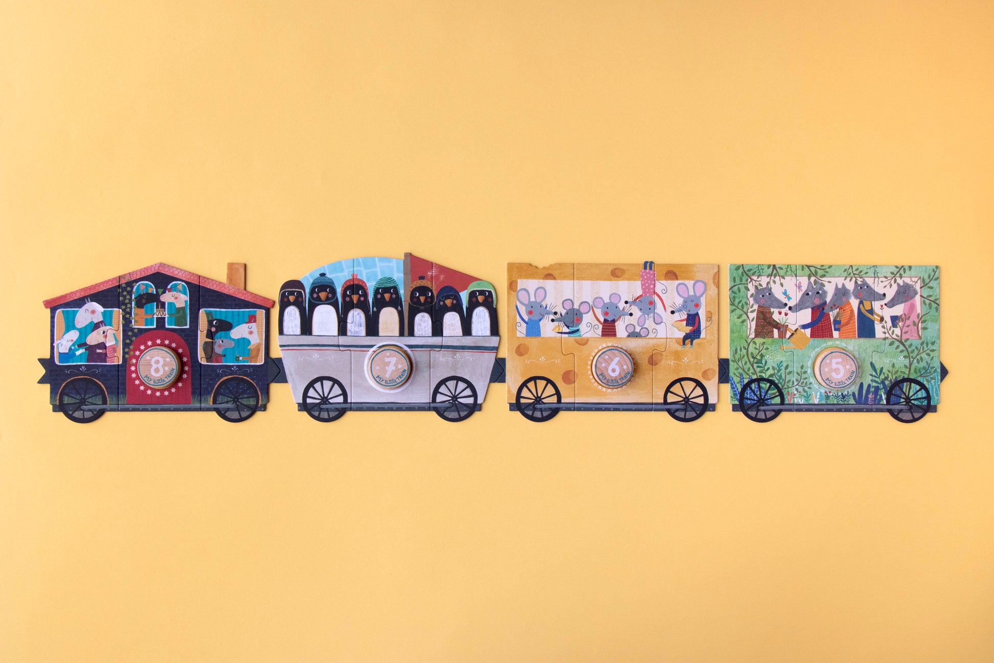 Nimm Teil an einer spannenden Reise mit Mein kleiner Zug von Londji. Zehn 3-teilige Puzzles in Form von Zugwaggons mit ungewöhnlichen Passagieren lassen kleine Kinder spielerisch von 1 bis 10 zählen. Ab 2 Jahren.
