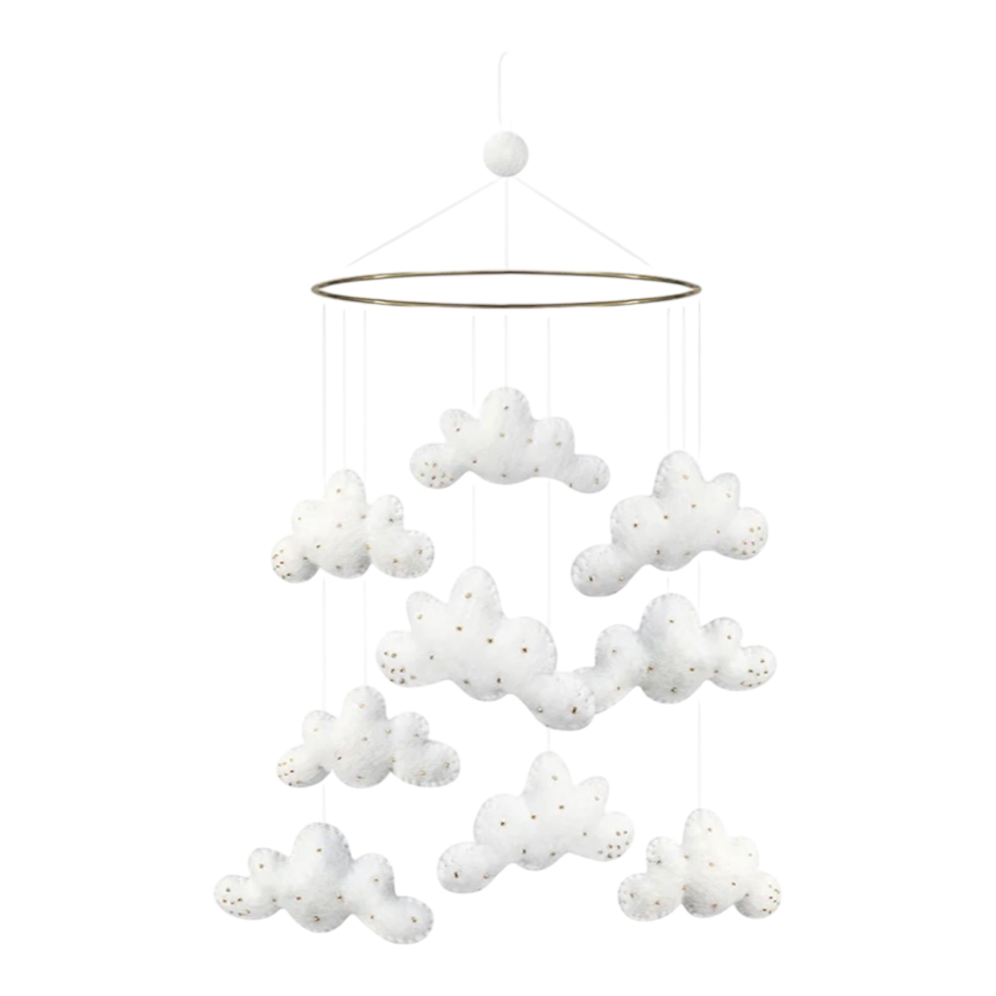Das Mobile Wolken von Gamcha ist ein wunderschönes Kunstwerk für das Kinderzimmer. Es besteht aus neun weißen Wolken mit goldenen Perlen und einem goldenen Ring. Es passt perfekt in jedes Kinderzimmer und ist eine einzigartige Geschenkidee für Babyshowers, Geburtstage oder als Geschenk zur Schwangerschaft. Jedes Produkt ist handgefertigt und besteht aus hochwertiger neuseeländischer Wolle und recyceltem Polyester. Maße: Durchmesser 20 cm, Höhe 52 cm.