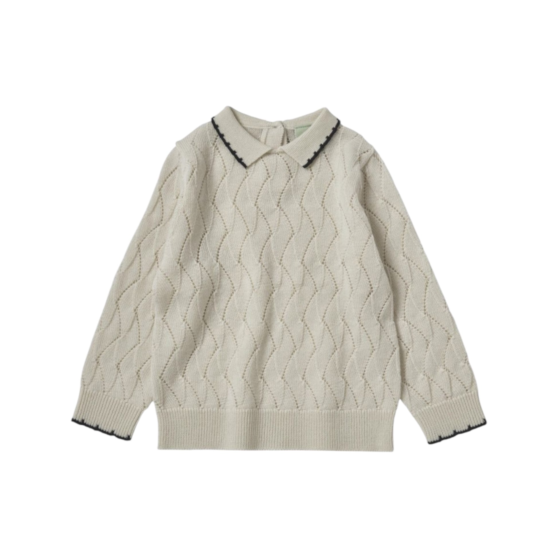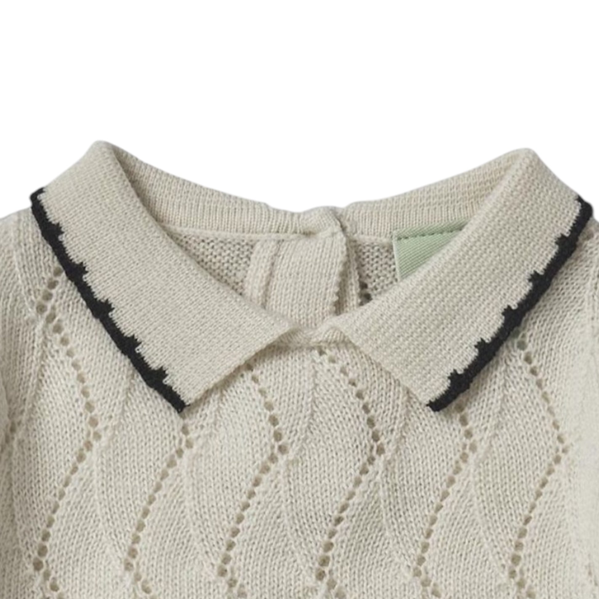 Der Pullover verfügt über einen flachen Hemdkragen, lange Ärmel und einen Knopfverschluss mit Perlmuttknöpfen im Rücken. Er ist in einer unifarbenen Variante oder mit kontrastfarbenen Kanten an Kragen und Ärmeln erhältlich. Die Merinowolle ist BLUESIGN- und RWS-zertifiziert, frei von schädlichen Chemikalien und stammt von nicht-mulesierten Schafen. Durch die umweltfreundliche Behandlung ist das Kleidungsstück maschinenwaschbar und OEKOTEX-, RWS- und BLUESIGN-zertifiziert.