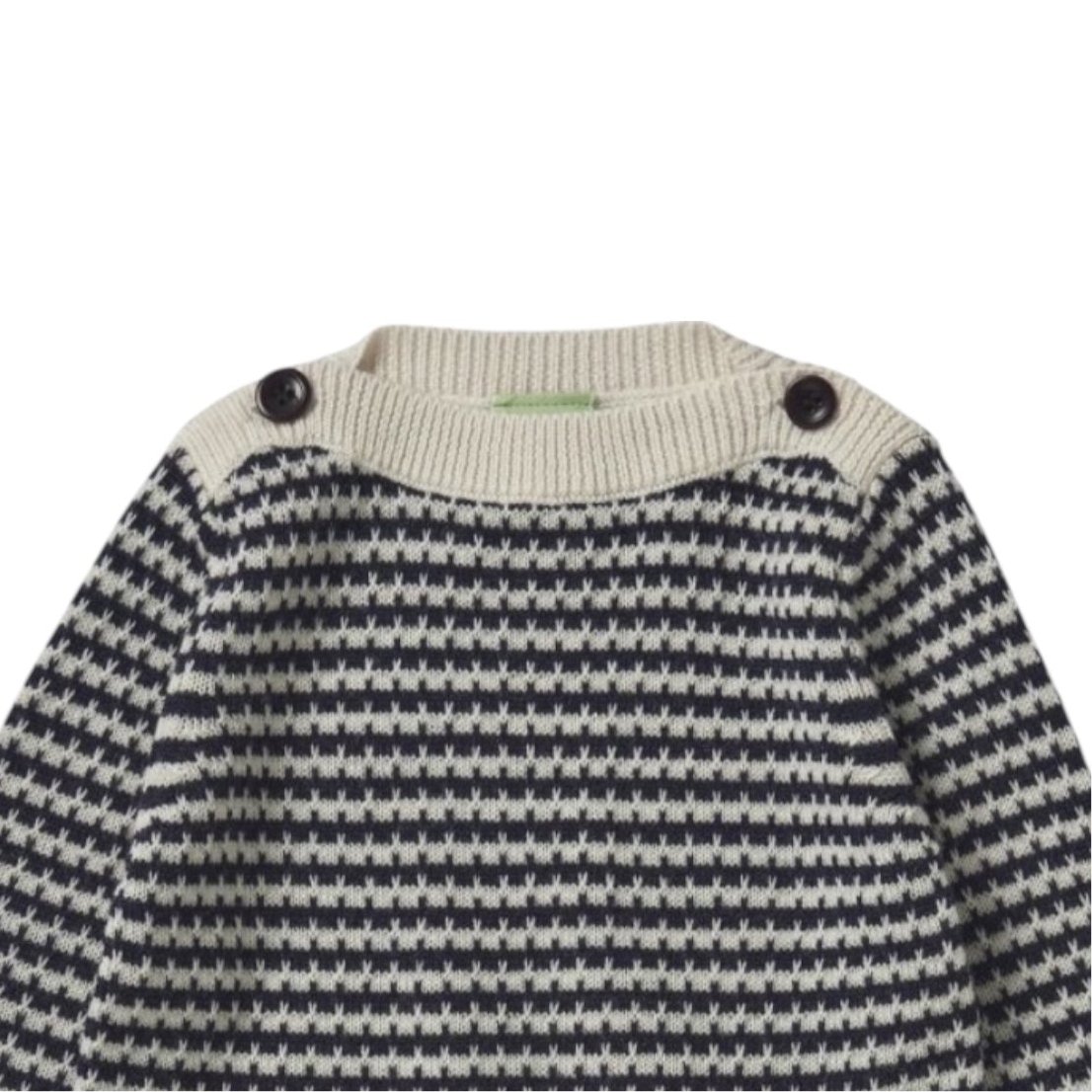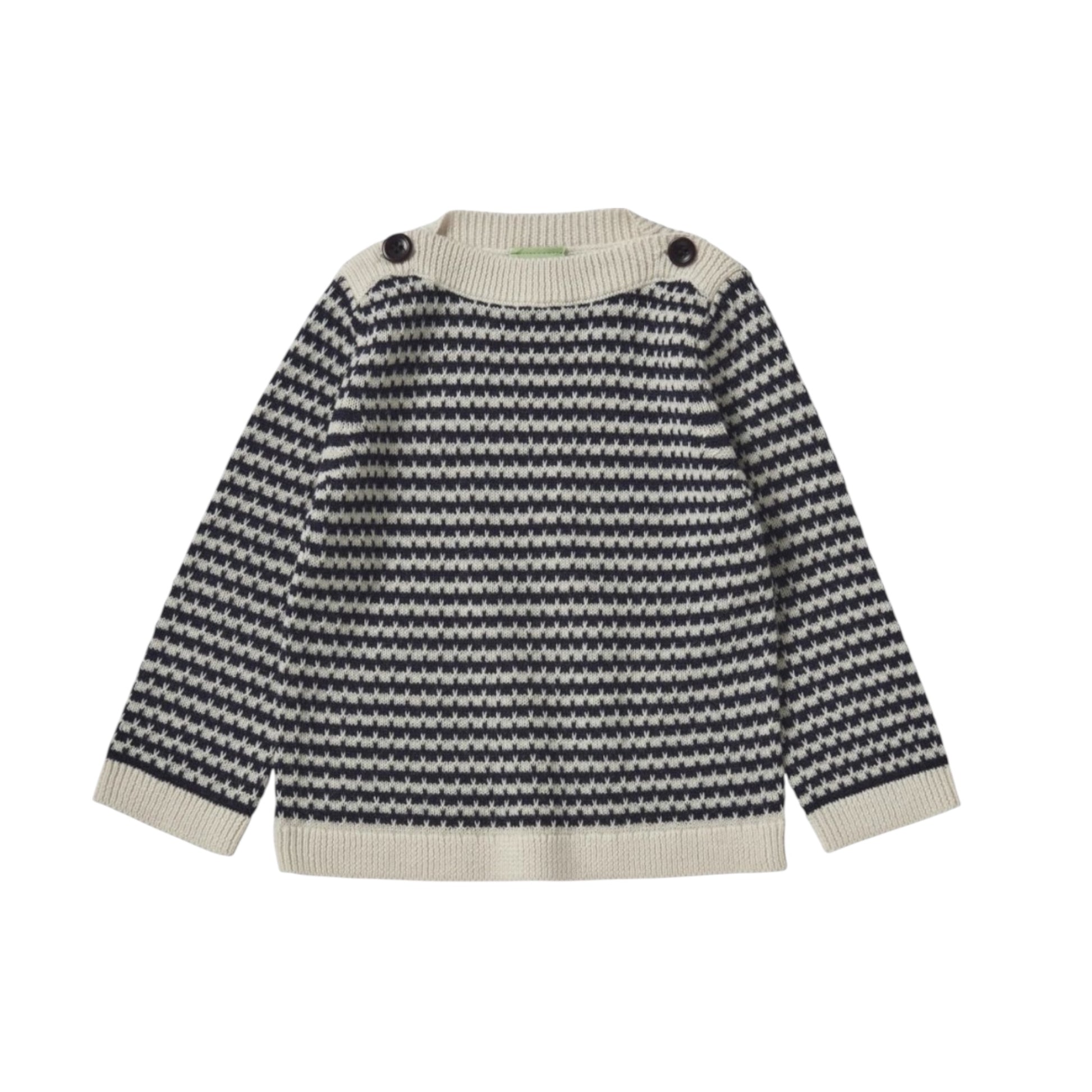 Dieser Pullover aus 100% OEKOTEX, RWS und BLUESIGN zertifizierter Merinowolle von Fub ist in einer weichen Struktur gestrickt und hat lange Ärmel, Rippenbündchen und einen Bootsausschnitt mit Knopfverschluss aus Corozonuss. Der geradlinige Schnitt und das zweifarbige Streifenmuster machen ihn zu einem klassischen Lieblingsstück. Die biologisch abbaubaren Knöpfe sind frei von schädlichen Chemikalien. Die Merinowolle stammt von nicht-mulesierten Schafen. Erfüllt höchste Qualitätsstandards und bietet wertvollen Komfort für Ihr Kind.