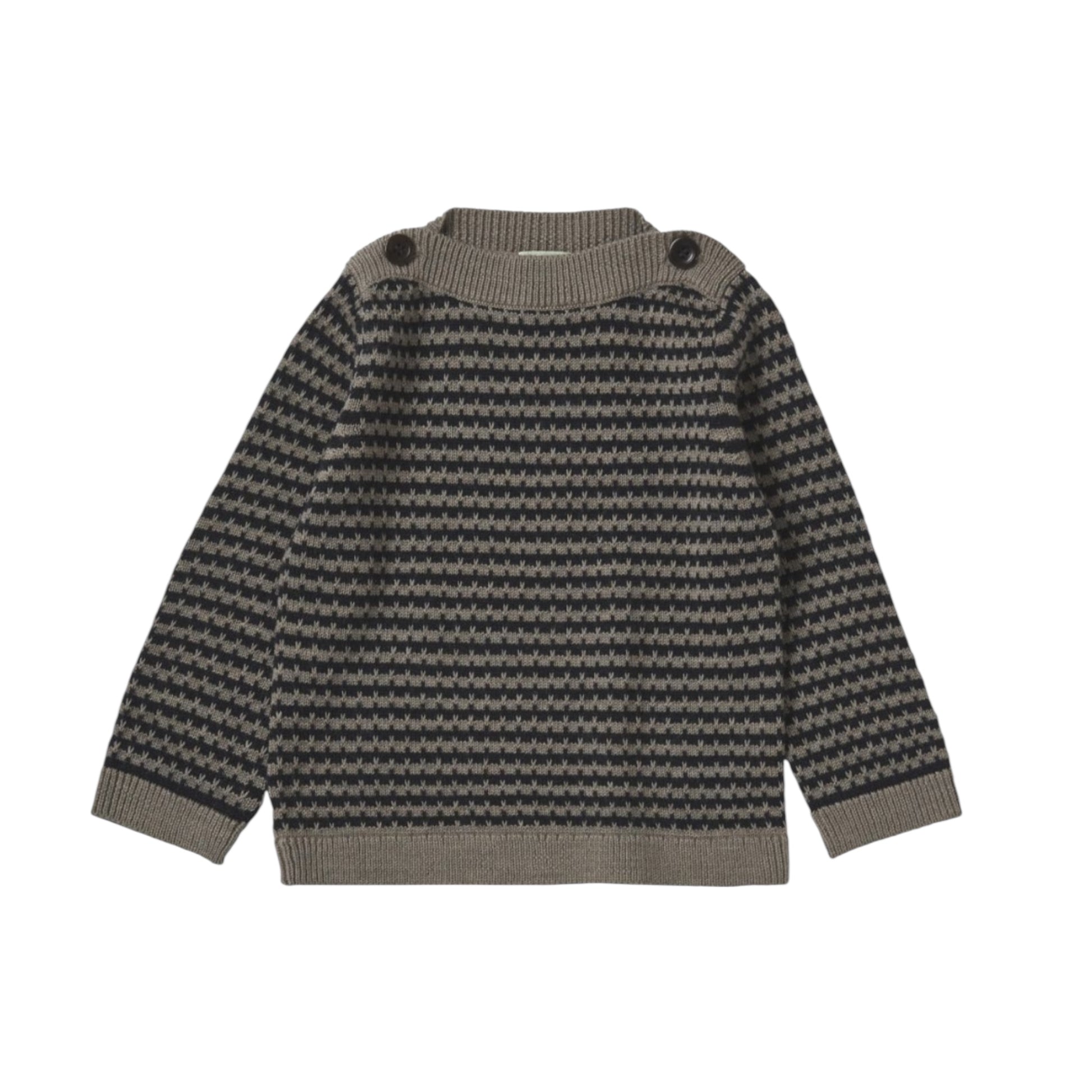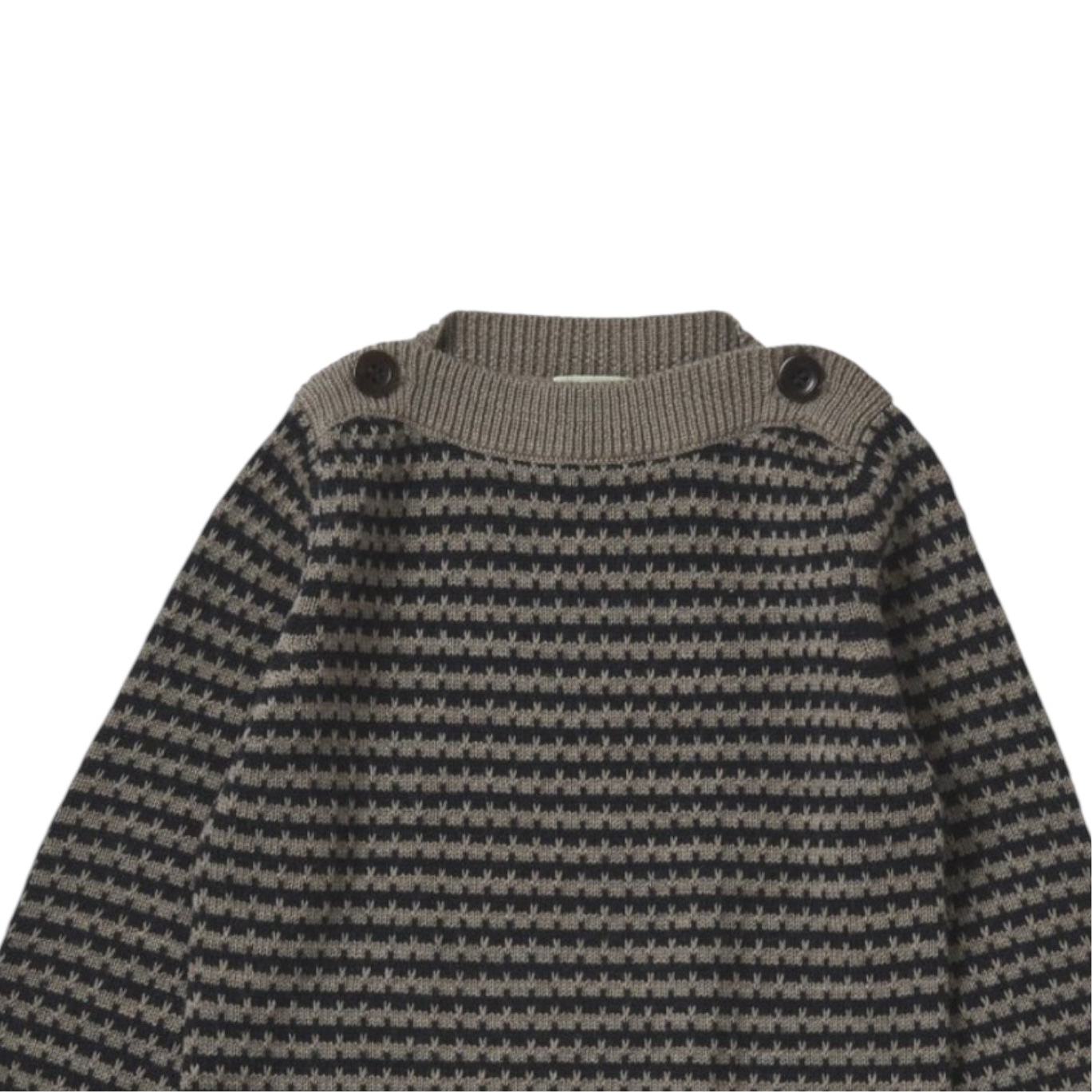 Dieser Pullover aus 100% OEKOTEX, RWS und BLUESIGN zertifizierter Merinowolle von Fub ist in einer weichen Struktur gestrickt und hat lange Ärmel, Rippenbündchen und einen Bootsausschnitt mit Knopfverschluss aus Corozonuss. Der geradlinige Schnitt und das zweifarbige Streifenmuster machen ihn zu einem klassischen Lieblingsstück. Die biologisch abbaubaren Knöpfe sind frei von schädlichen Chemikalien. Die Merinowolle stammt von nicht-mulesierten Schafen. Erfüllt höchste Qualitätsstandards und bietet wertvollen Komfort für Ihr Kind.