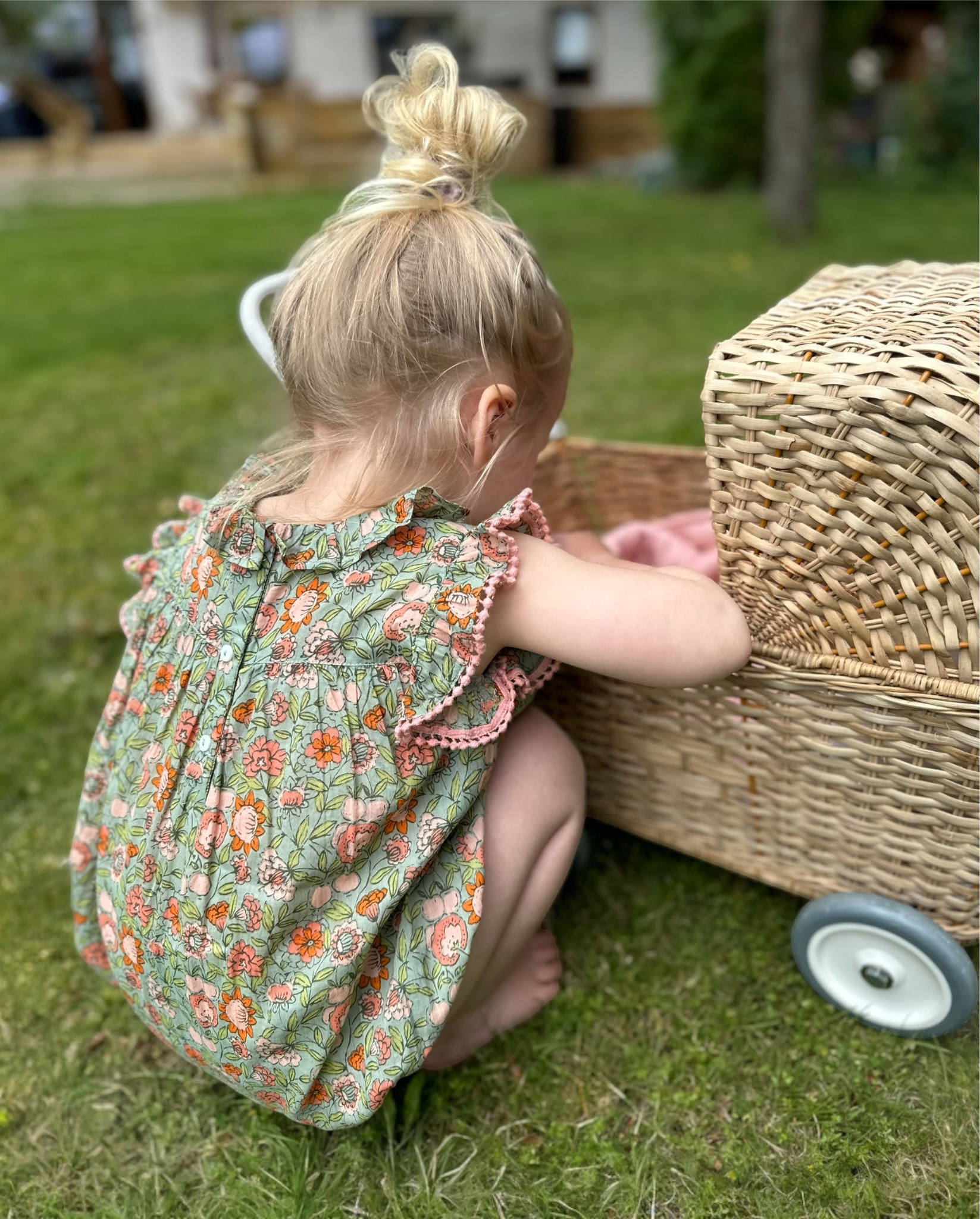Der stilvolle und umweltfreundliche Puppenwagen ist ideal für den Frühlingsspaziergang. Mit einer Größe von 50 x 36 x 30 cm und einer Belastbarkeit von max. 10 kg bietet er Puppe und Teddy einen bequemen Platz zum Ausruhen und die Möglichkeit, die Sonne zu genießen. Handgewobener Rattan und ein lackierter Stahlrahmen sorgen für Stabilität und Langlebigkeit. Passende Decke und Kissen separat erhältlich. Für Kinder ab 3 Jahren geeignet.