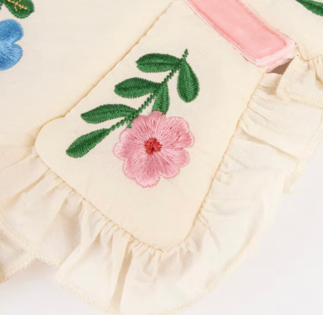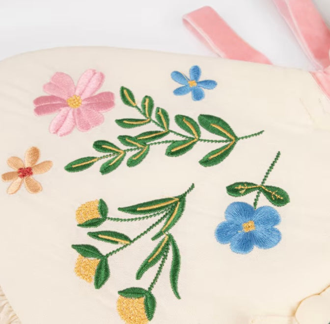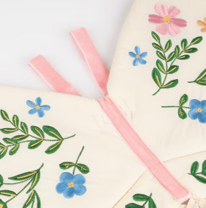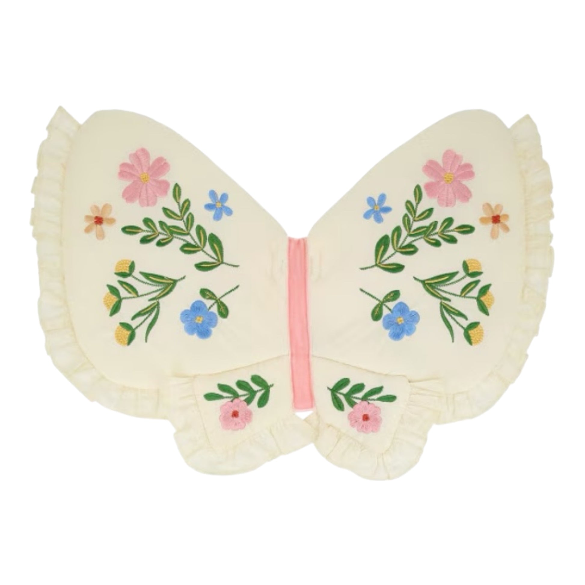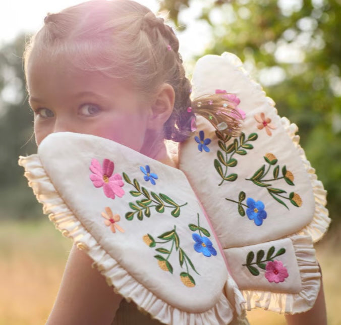 Diese Schmetterlingsflügel von Meri Meri sind aus natürlicher Baumwolle gefertigt und mit einer leichten Polyesterpolsterung versehen. Die bestickten Blumen in Blau, Grün, Gold, Gelb, Rosa und Pfirsich sowie die gerüschten Baumwollrüschen verleihen ihnen einen verspielten Look. Verstellbare rosa Samtbänder und elastische Bänder sorgen für einen bequemen Sitz. Geeignet für Kinder im Alter von 3-6 Jahren.