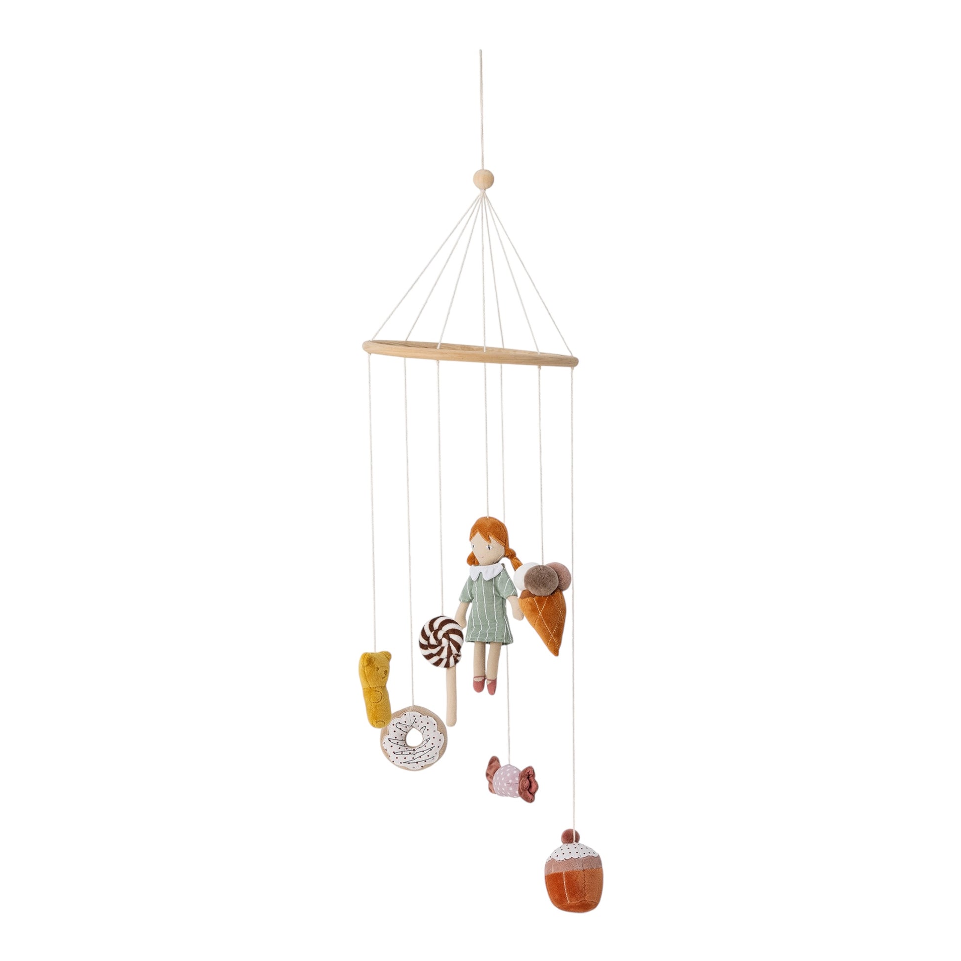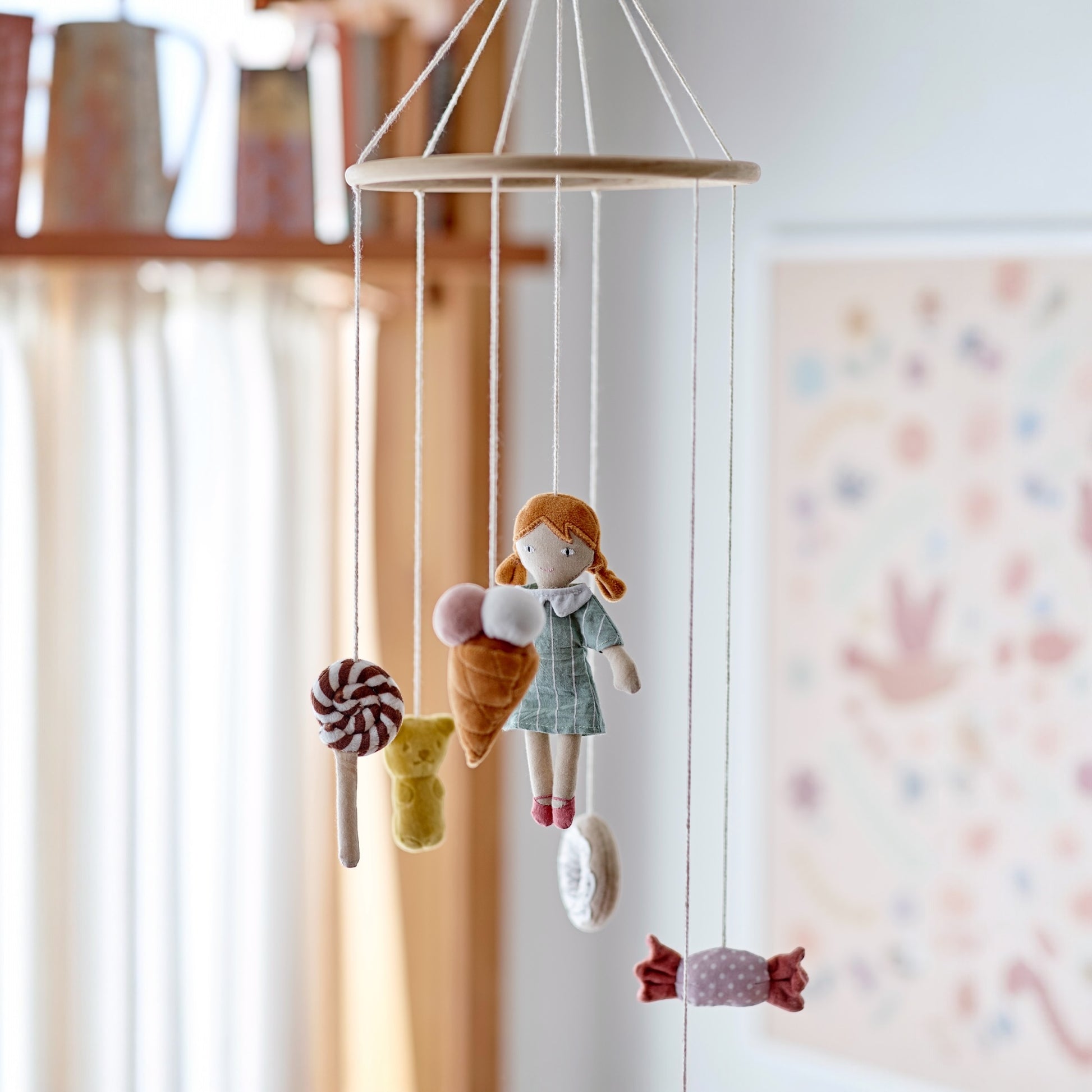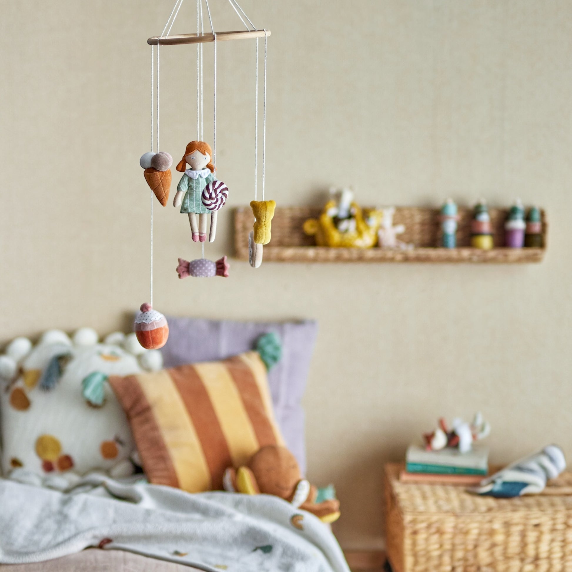 Das Sweets Mobile von Bloomingville ist ein süßes Accessoire für das Kinderzimmer. Es zeigt ein niedliches Mädchen und bunte Bonbonstücke und kann über dem Babybett oder Wickeltisch aufgehängt werden. Hergestellt aus 100% Baumwolle und gefüllt mit weichem Polyester, ist es sowohl schön anzusehen als auch kuschelig für Ihr Baby. Maße: D20,5xH50 cm.