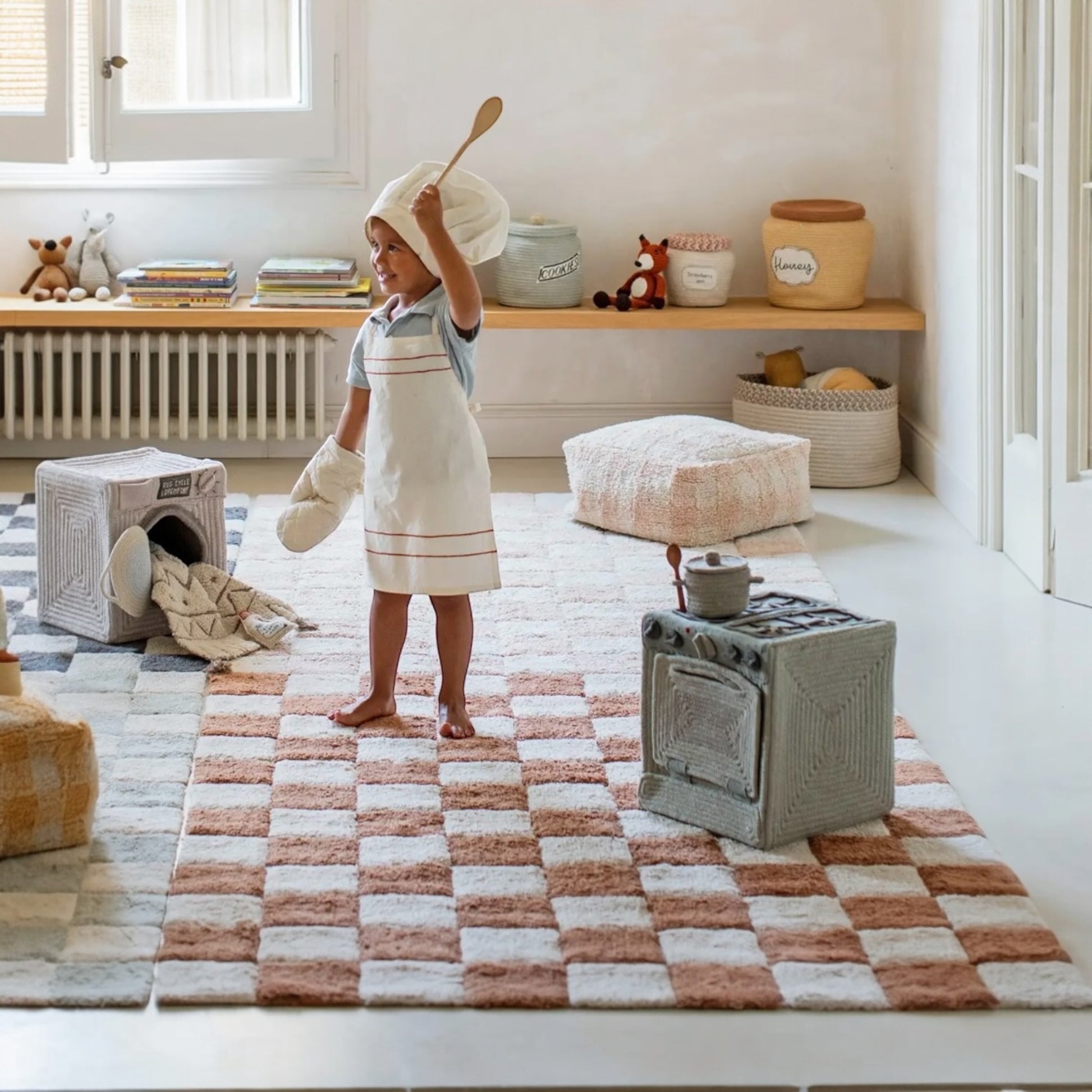 Ein Hauch von Nostalgie für Ihr Zuhause - der Teppich „Küchenfliesen“. Das traditionelle Schachbrettmuster von Omas Vintage-Küchenfliesen wird auf einer weichen und langlebigen RugCycled® Basis dargestellt. Kontrastierende Quadrate in Toffee und Creme verleihen jedem Raum ein mutiges Statement. Die Fugen der Kacheln geben den Blick auf die natürliche, ungefärbte Leinwand frei, die einzigartig ist für jedes Stück. Machen Sie Ihren Raum noch gemütlicher und fühlen Sie sich wie zu Hause!