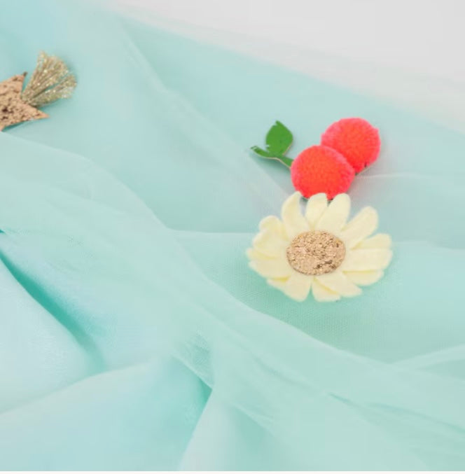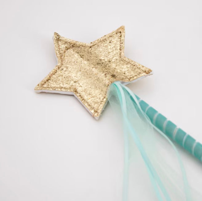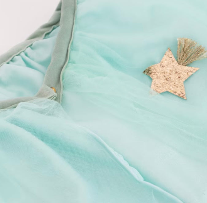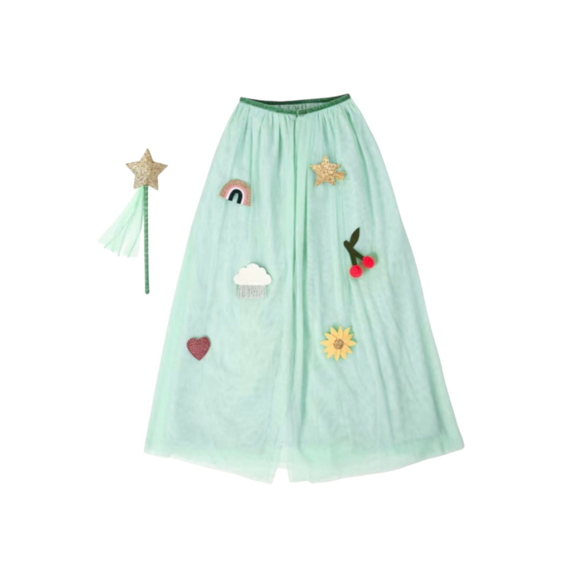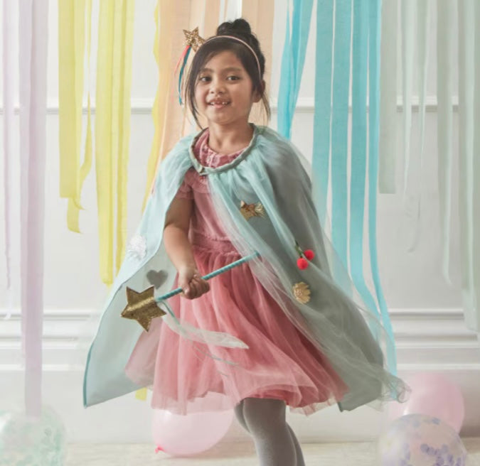 Dieser atemberaubende Umhang von Meri Meri ist das perfekte Accessoire für kleine Zauberinnen und Zauber. Der Umhang ist aus zartem Tüll gefertigt und mit süßen Applikationen verziert. Der samtene Besatz und der praktische Druckknopf sorgen für einen sicheren Sitz. Mit dem passenden Holzstab, verziert mit glitzerndem Stoff und Bändern, können Kinder ab 3 Jahren magische Momente erleben.