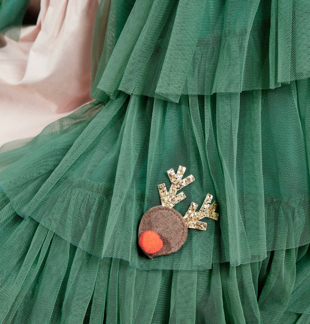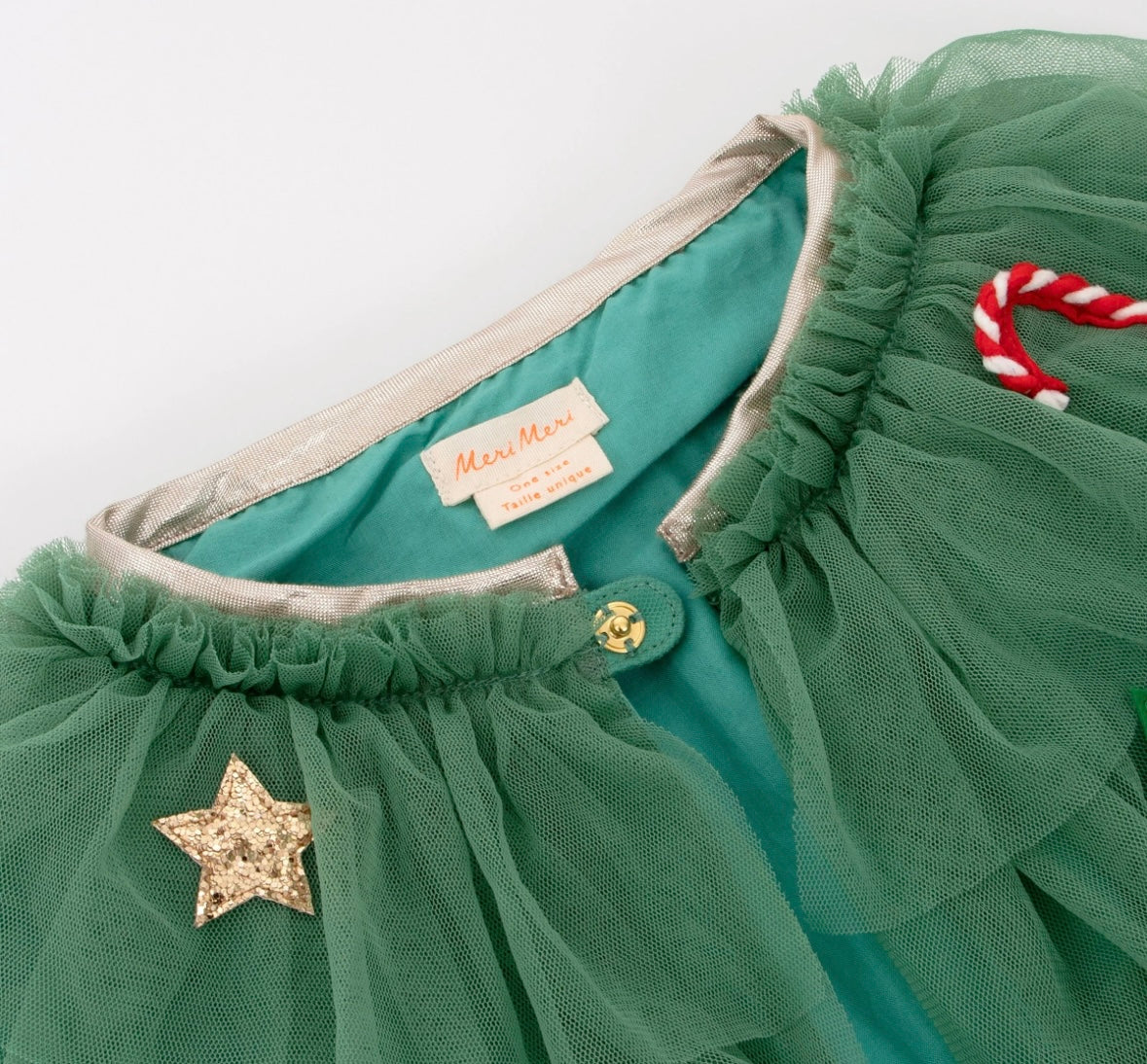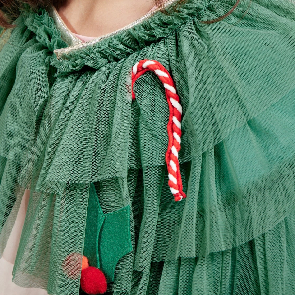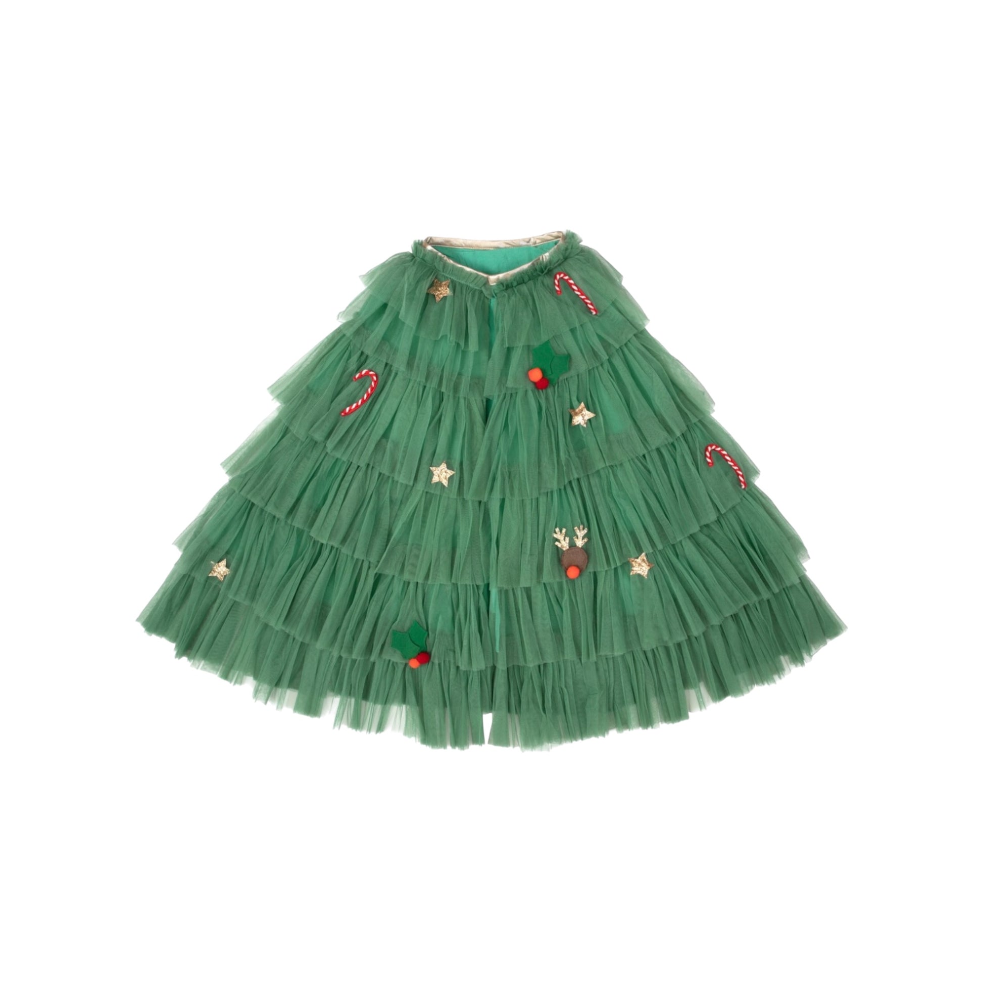 Dieser Umhang von Meri Meri besteht aus mehreren Schichten aus hellgrünem Tüll, mit einem dunkelgrünen Polycotton-Futter und einer goldglitzernden elastischen Kragen. Der Umhang ist mit Rentieren, Stechpalmen, Sternen und Zuckerstangen verziert, die aus Bändern, Filz, goldglitzerndem Stoff und Pompons bestehen. Dazu gehört auch ein flexibler, mit Goldstoff überzogener, Haarreif mit goldglitzernden Sternen. Geeignet für Kinder im Alter von 3-6 Jahren.