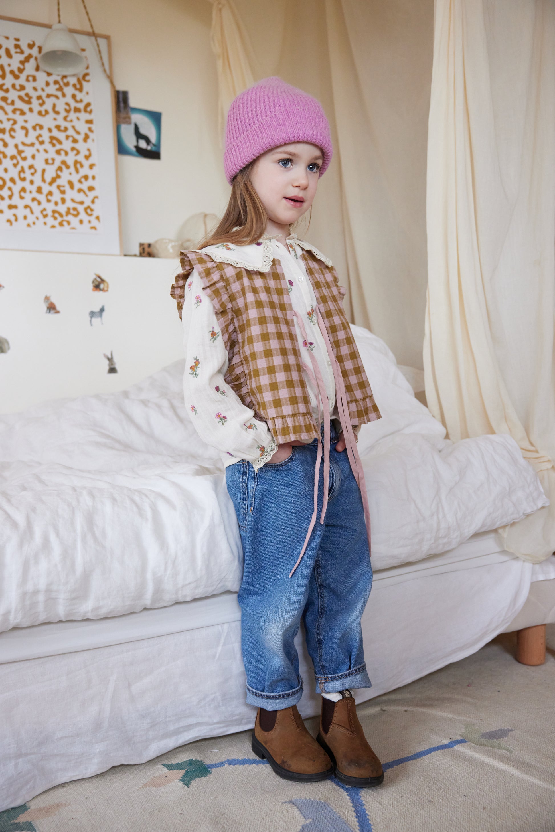 Diese karierte Weste aus reiner Baumwolle von Bonheur du jour Paris ist ein modisches Statement. Mit ihren süßen Schleifen zum Schließen ist sie nicht nur ein Hingucker, sondern auch praktisch. Perfekt für kleine Fashionistas!
